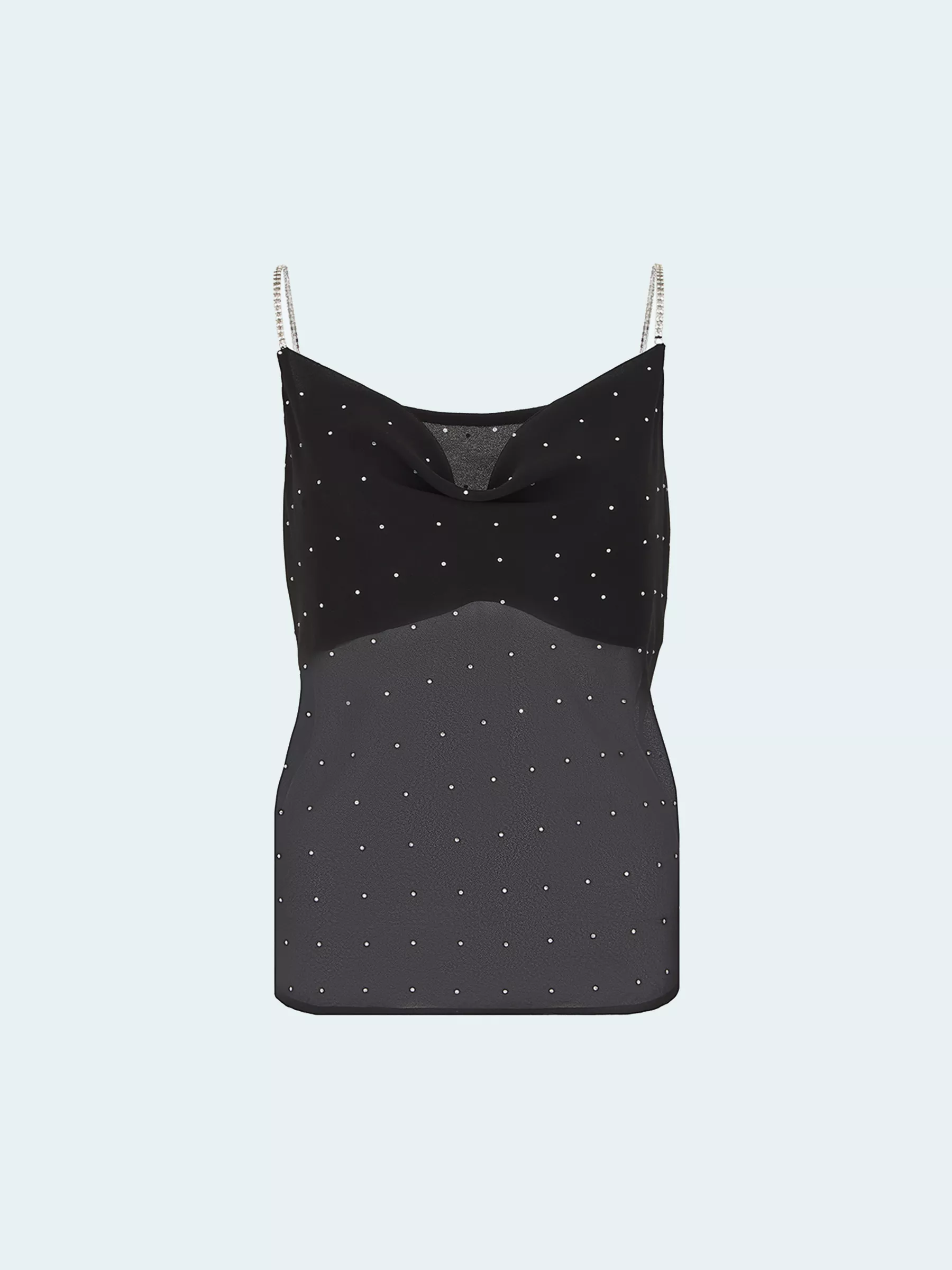 Полупрозрачный топ из лёгкого и мягкого шифона в чёрном цвете украшен рядами некрупных страз с деликатным звёздным сиянием. Они не перегружают образ, но делают его интереснее. Тонкие акцентные бретели также украшены стразами, немного более крупными. Топ легко и красиво садится, элегантно смотрится за счёт лаконичного фасона без лишних деталей. Модель маломерит на один размер. Выполнена без подкладки.