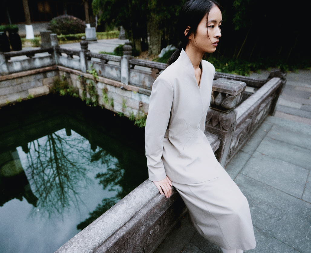 Костюм с мотивом оригами, необычной фактурой и спокойной расцветкой идеален для офиса. Он поддержит деловой настрой и поможет произвести достойное впечатление.