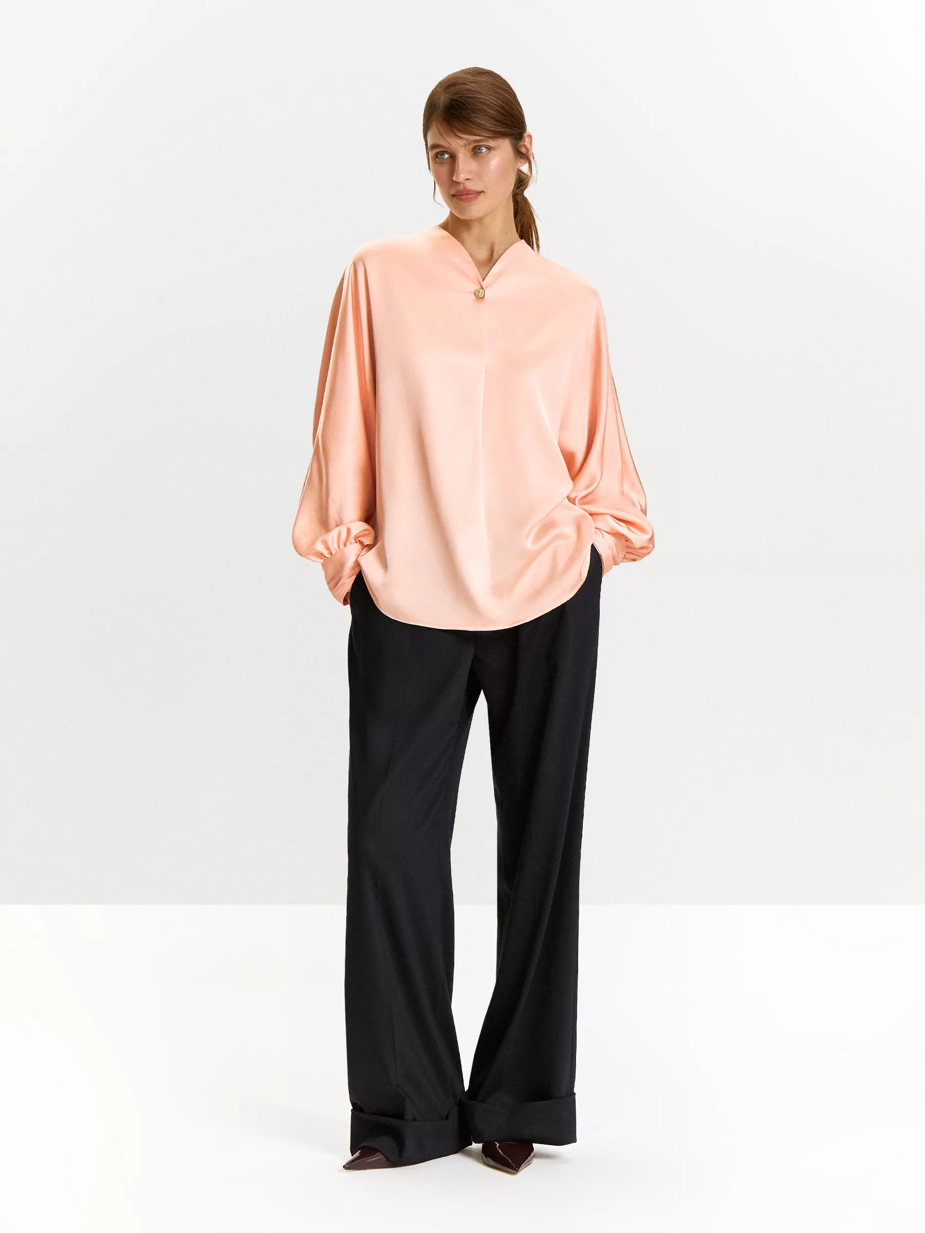 Атласная вискоза с деликатным блеском приятно струится, отзывается на каждое движение грациозными драпировками. За счёт содержания полиэстера не мнётся и не создаёт заломы: образ выглядит свежим и гладким, как цветок лотоса. Это впечатление поддерживает и нежный пастельный оттенок розового. Розовый сейчас среди самых модных цветов сезона.