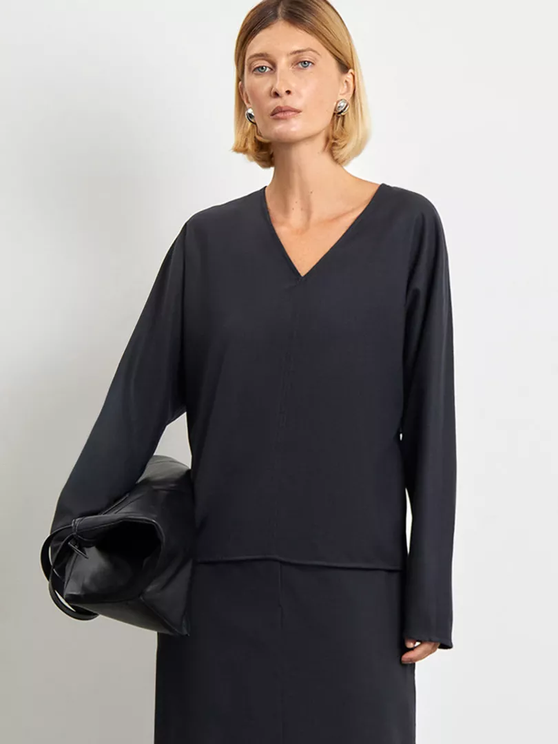 Оригинальная блузка серого цвета. Выполнена из костюмного материала с высоким содержанием вискозы. Блузку отличают длинный рукав формата "летучая мышь", а также декоративная прострочка по центру: на передней части и на спинке изделия. Модель прямого кроя имеет V-образный вырез. Дополнить образ можно брюками или юбкой из комплекта.