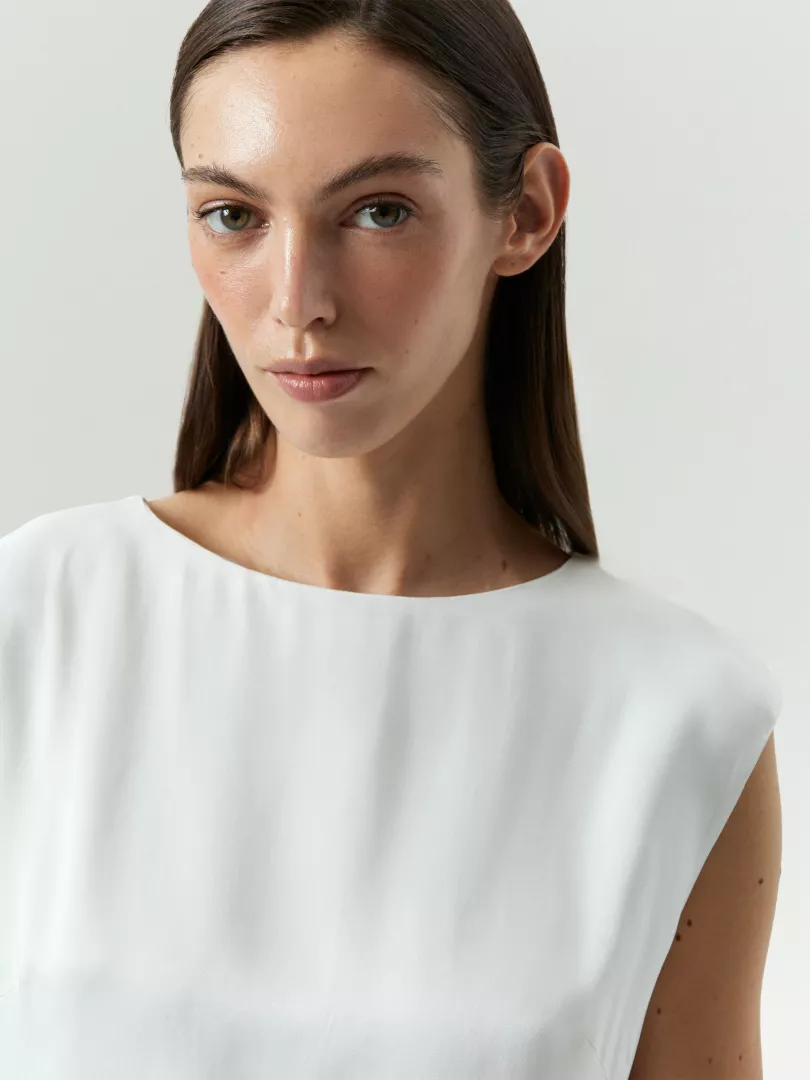 Базовая блуза в белом цвете сделана из приятного к телу, мягкого и шелковистого вискозного сатина. Топ без рукавов со спущенным плечом слегка прикрывает верхнюю часть руки и закрывает грудь, горловина подходит к ярёмной впадине. Удлинённая модель прямого кроя удобна для образов с жакетами, сочетается с базовым и с нарядным низом. Отлично садится на любую фигуру. Изделие выполнено на подкладке из вискозы.