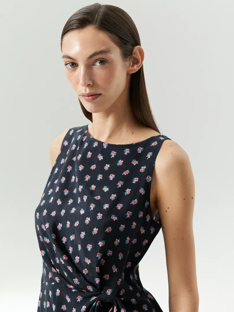Очень элегантный топ с узлом, запахом и неглубоким вырезом-лодочкой станет любимой вещью в гардеробе. Выполнен из приятной на ощупь купры. Женственный и модный принт мильфлёр сделает романтичнее повседневные образы, создаст настроение к особому случаю. Принт с сочетанием розового и голубого позволяет встраивать в образ другие вещи в этих цветах. Топ можно дополнить юбкой из комплекта, любым базовым низом и не только. Он может стать частью капсулы с платьем july.