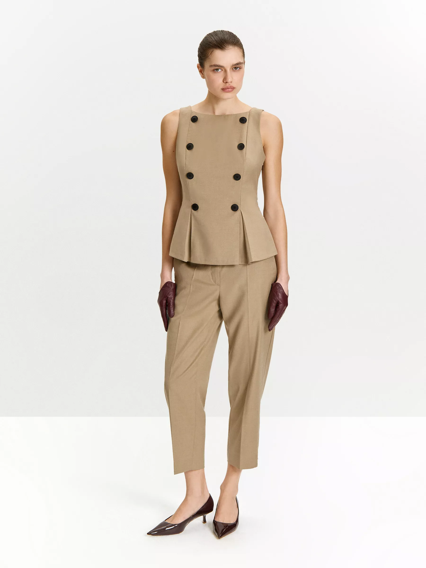 Топ выполнен с рельефами по груди, которые переходят в изящные складки. Украшен двумя рядами пуговиц. Такой минималистичный декор уместен и в деловых, и в нарядных образах.