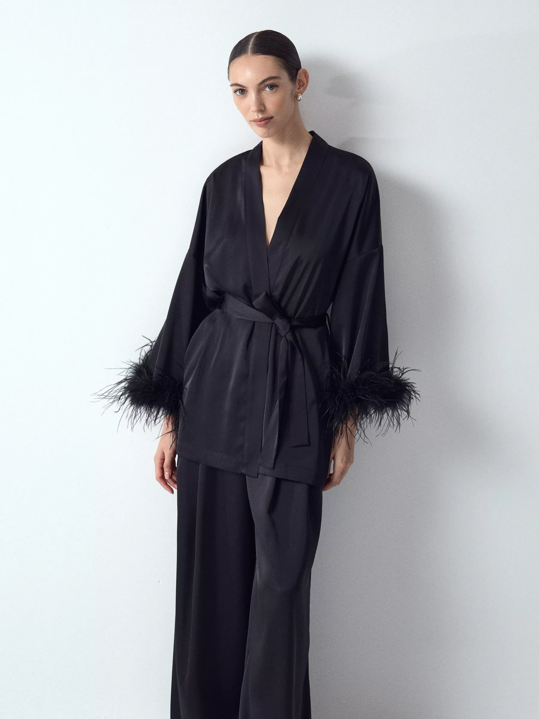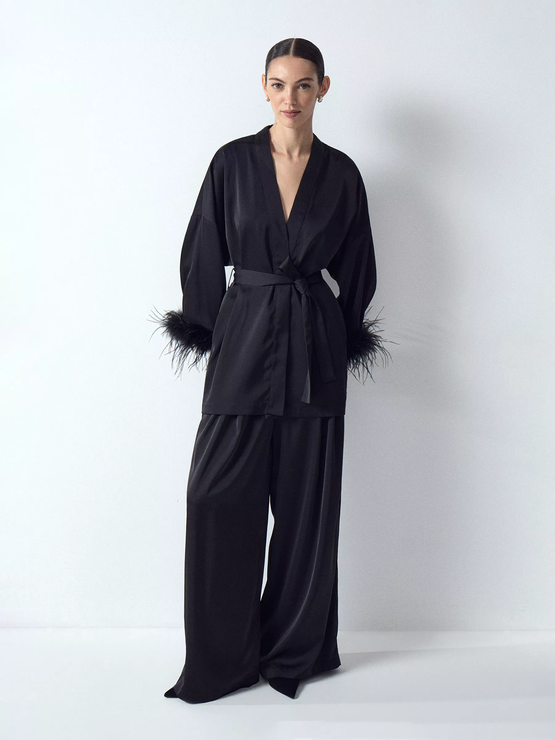 Брюки палаццо чёрного цвета сделают образ роскошнее. Стильная высокая посадка на широкой резинке обеспечит комфорт. Брюки изготовлены из струящегося материала с содержанием вискозы, без подкладки. Дополнить можно стильной блузкой из комплекта.