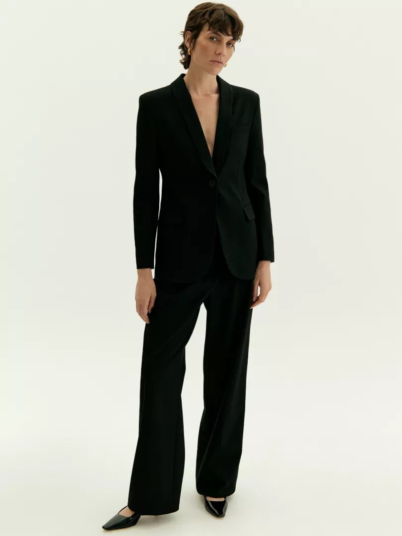 Стильные брюки в чёрном цвете разнообразят повседневные образы. Модель полной длины с высокой посадкой отличают застёжка сбоку и защипы по бокам. Предусмотрены шлёвки для ремня. Изделие застёгивается на молнию и пуговицу. Брюки выполнены из приятной костюмной ткани с вискозой. Вещь может стать частью капсулы с другими брюками, юбкой и жакетом monk.
