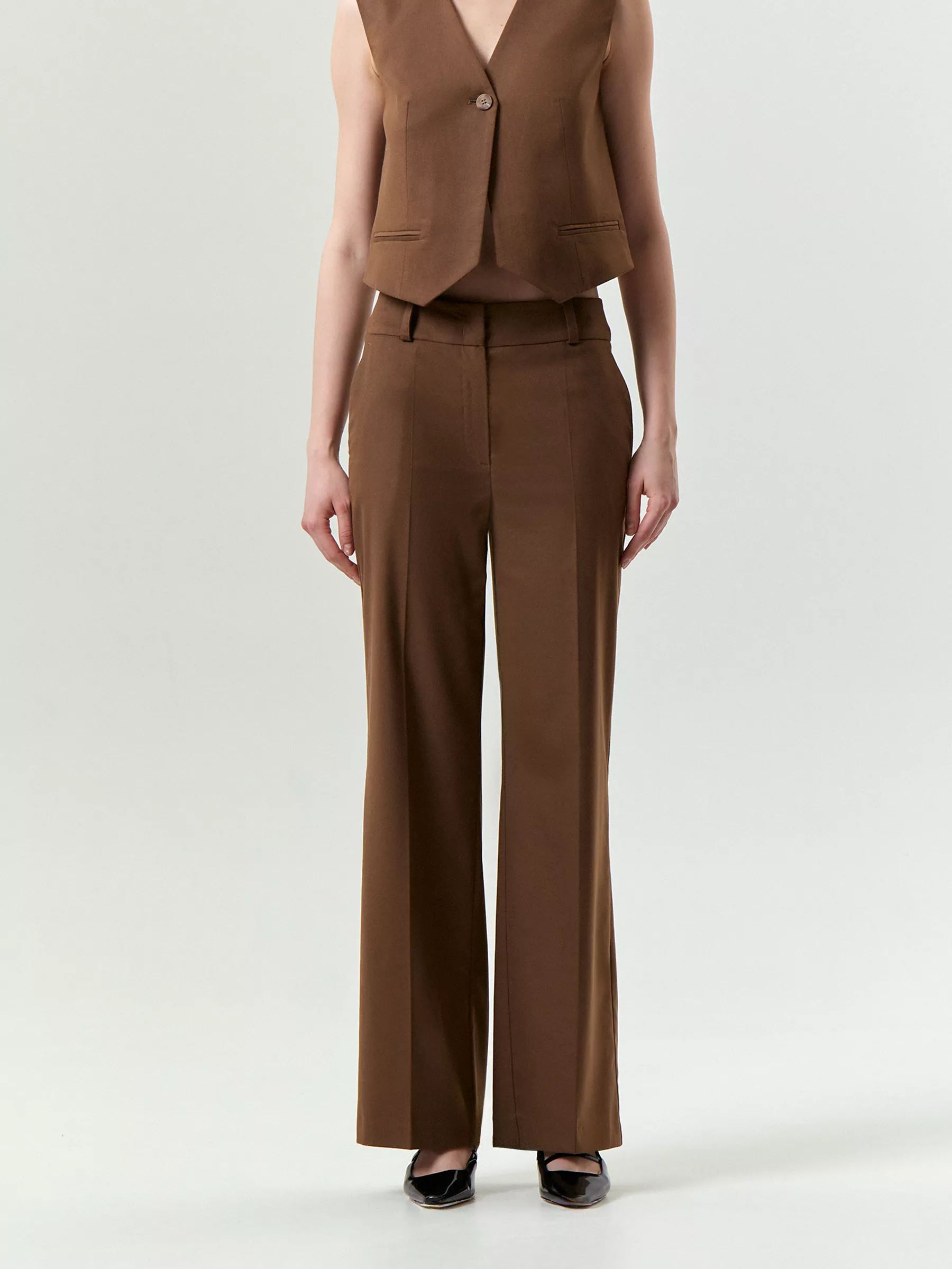 Брюки на каждый день в одном из главных цветов сезона — мокко. Сделаны из комфортного, мягкого материала, по ощущениям немного напоминающего байку. В составе — почти четверть шерсти и ещё четверть вискозы. Прямая модель с широким поясом имеет среднюю посадку. Образ можно дополнить жакетом или жилетом из комплекта stingray.