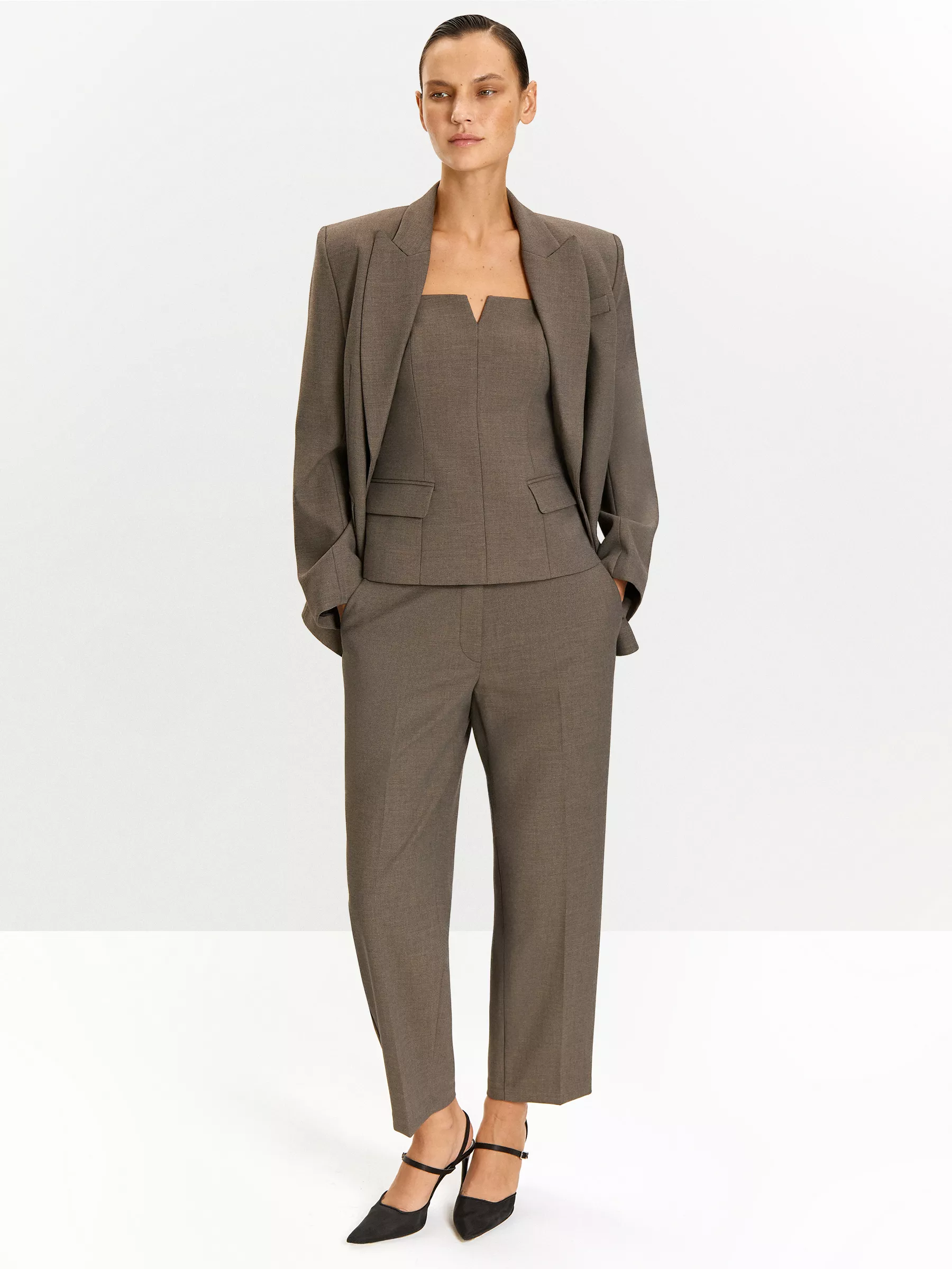 Дополнить брюки можно топом или жакетом из комплекта. Брюки могут стать частью капсулы с платьем, топом и жакетом choco.