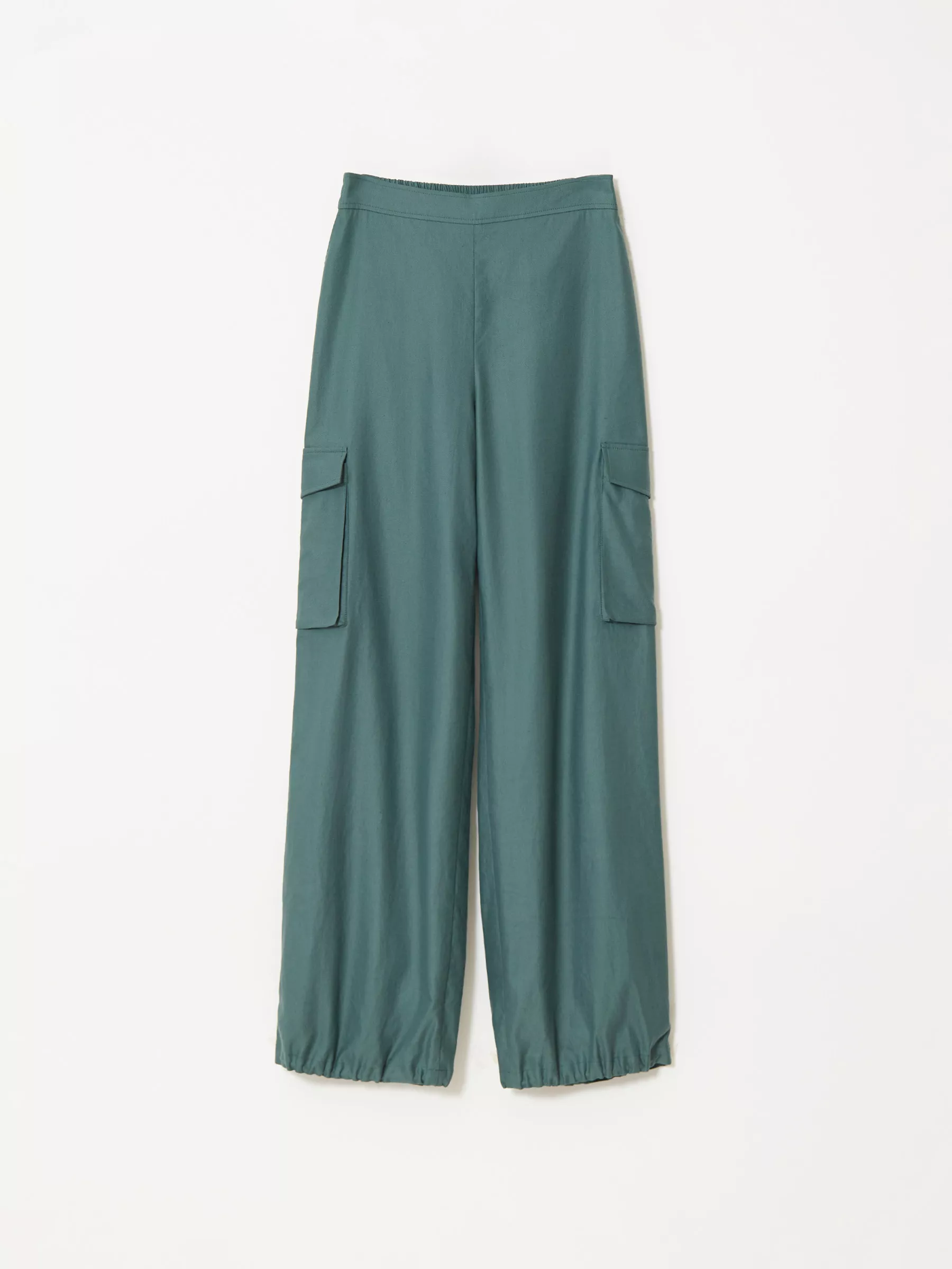 Брюки в модном оттенке зелёного изо льна и хлопка. Свободная модель карго с высокой посадкой и прямым кроем подойдёт на каждый день. Дополнить образ можно жакетом из комплекта и базовым трикотажем.