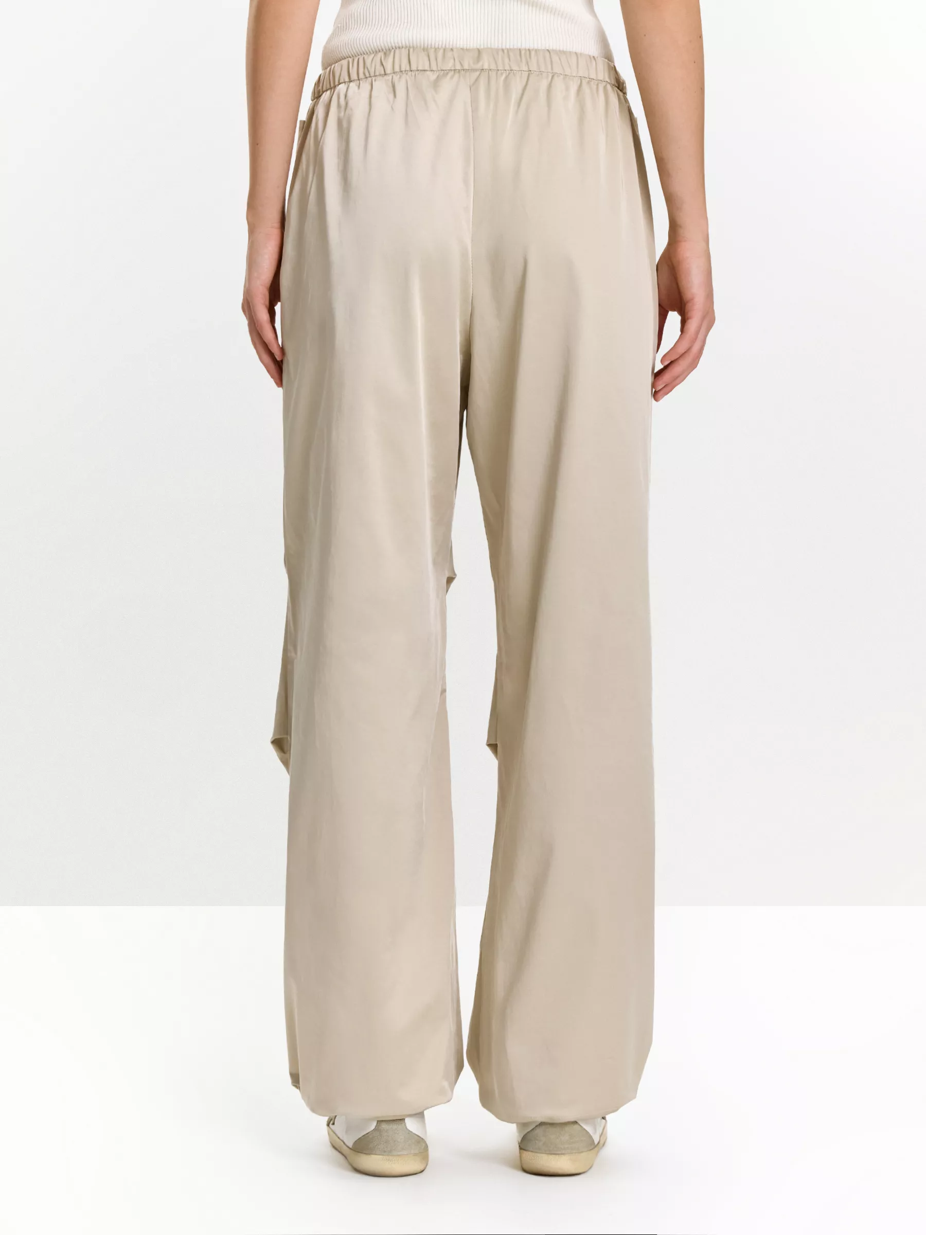 Трендовые брюки в спортивном стиле. Хлопковая тафта сложного светлого оттенка в костюме — эффектное решение для повседневных образов. Защипы на брючинах придают образу больше воздуха. Свободная модель-трансформер имеет кулиски с регулирующими элементами не только в талии, но и в нижней части брючин. Посадку и фасон брюк можно менять по настроению. Завершить образ можно бомбером из комплекта.