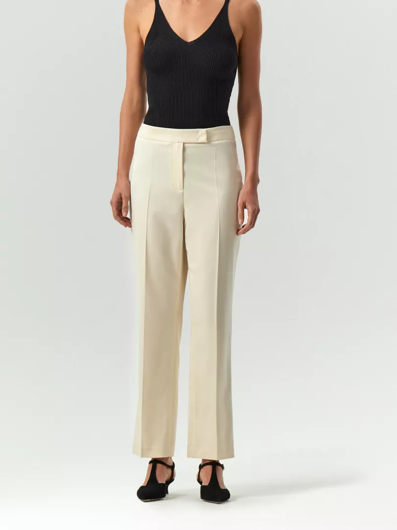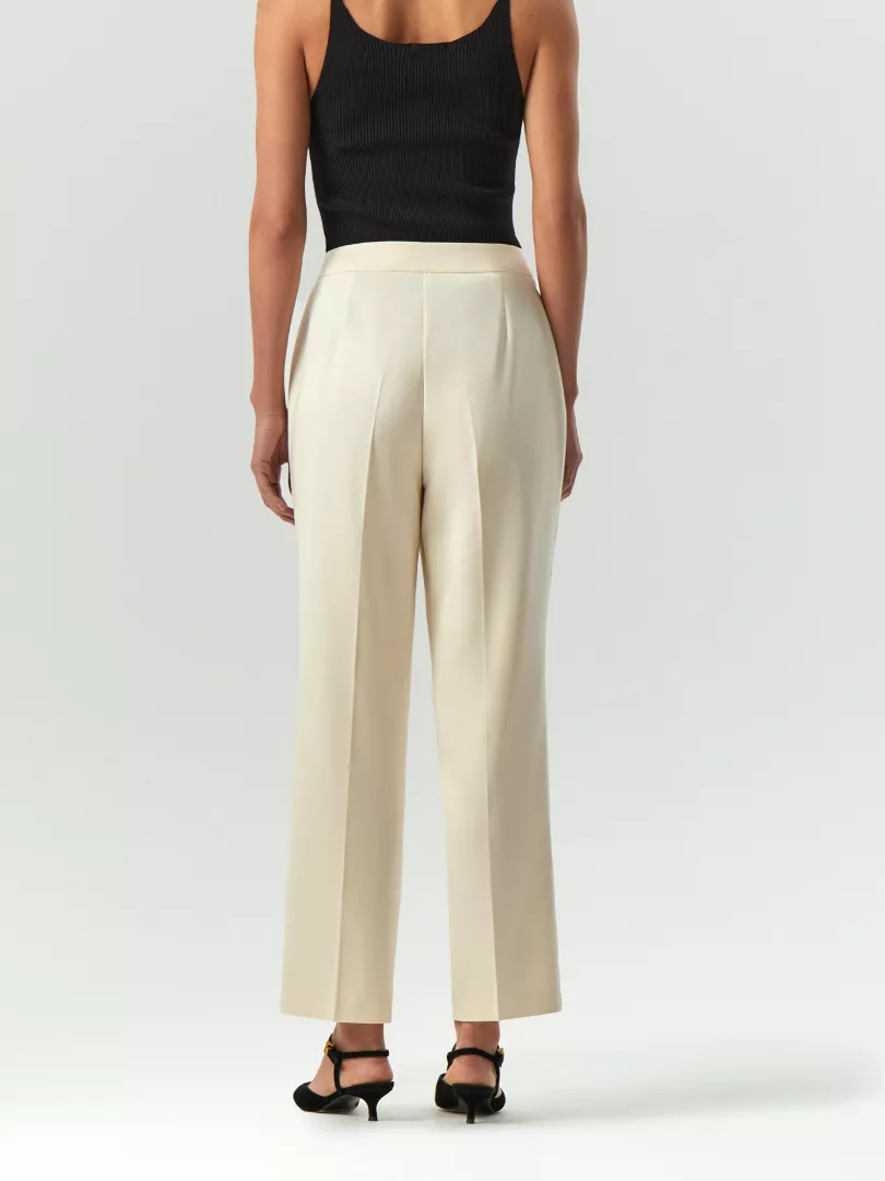 Стильные зауженные брюки в молочном цвете отлично подойдут для особого случая и на каждый день. Материал из тонкой шерсти и мягкой вискозы с эластаном смотрится премиально, даёт комфортную посадку по фигуре. Завершить образ можно жакетом из комплекта.