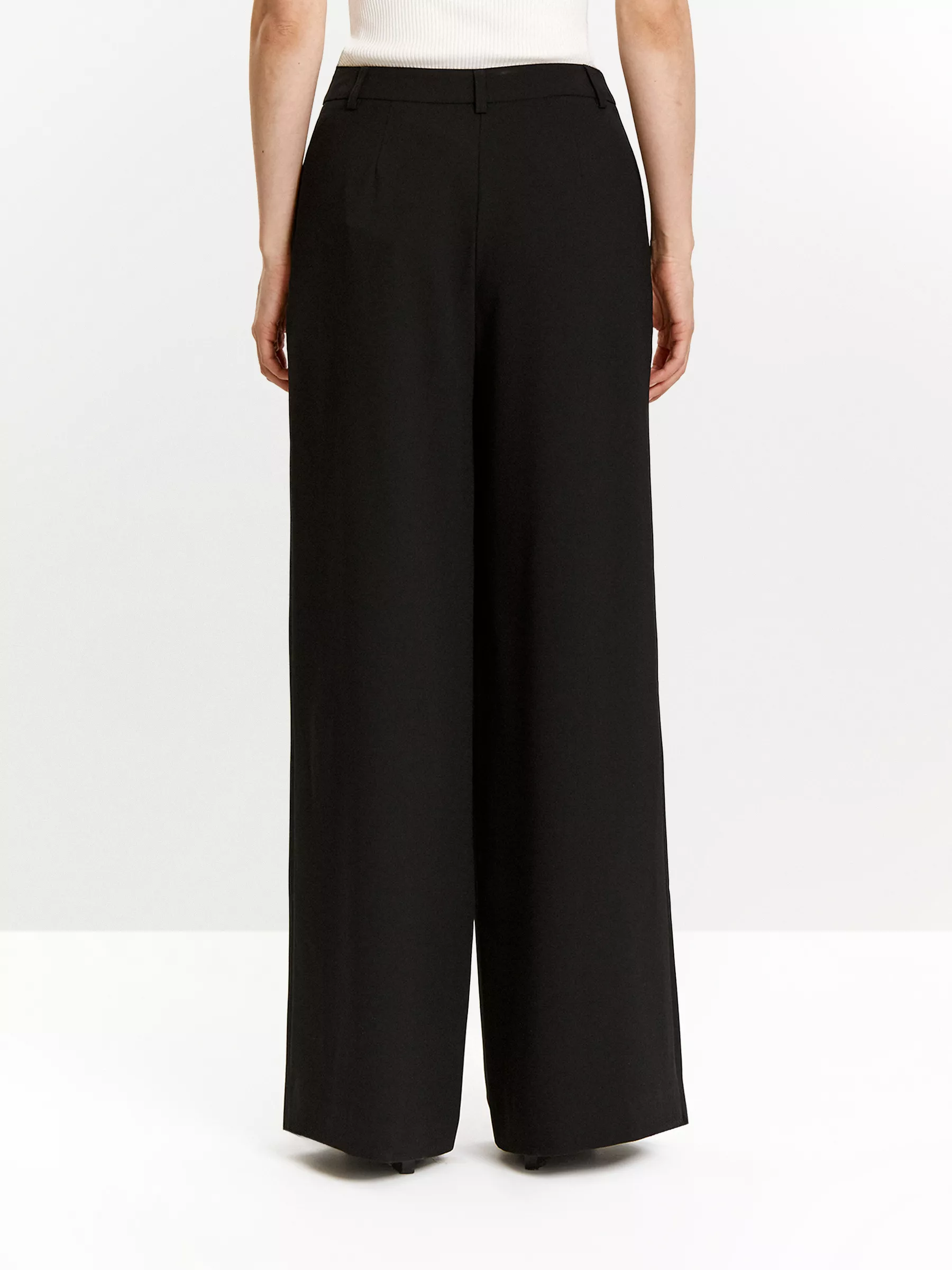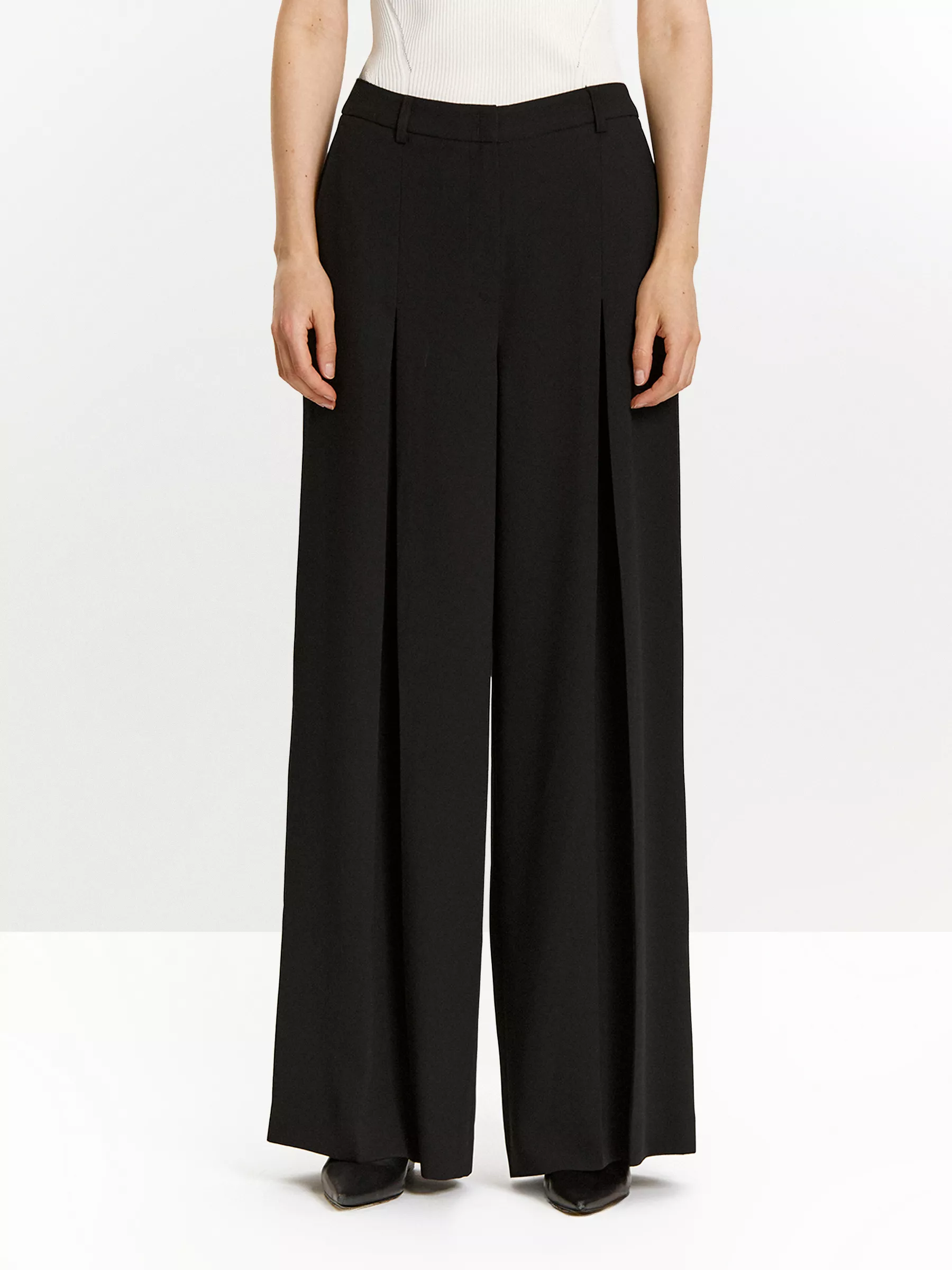 Эти брюки отличают большие зеркальные защипы. Они открываются в движении, добавляя образу динамики. Модель имеет полную длину и стандартную посадку. Застёгивается на крючки.