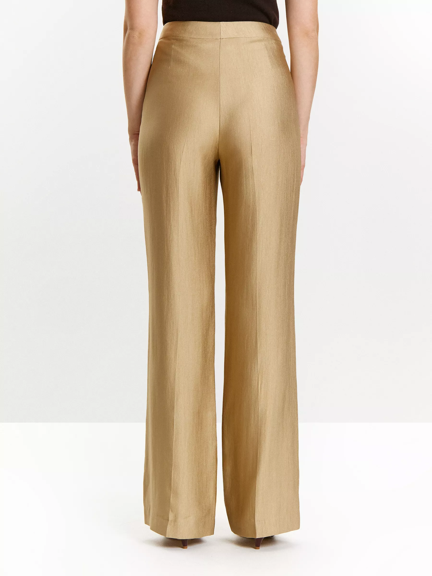 Главное достоинство брюк — благородный золотистый отлив на песочной базе, цвет золотого песка. Он смотрится и деликатным, и сияющим в одно и то же время. Это умеренная роскошь.