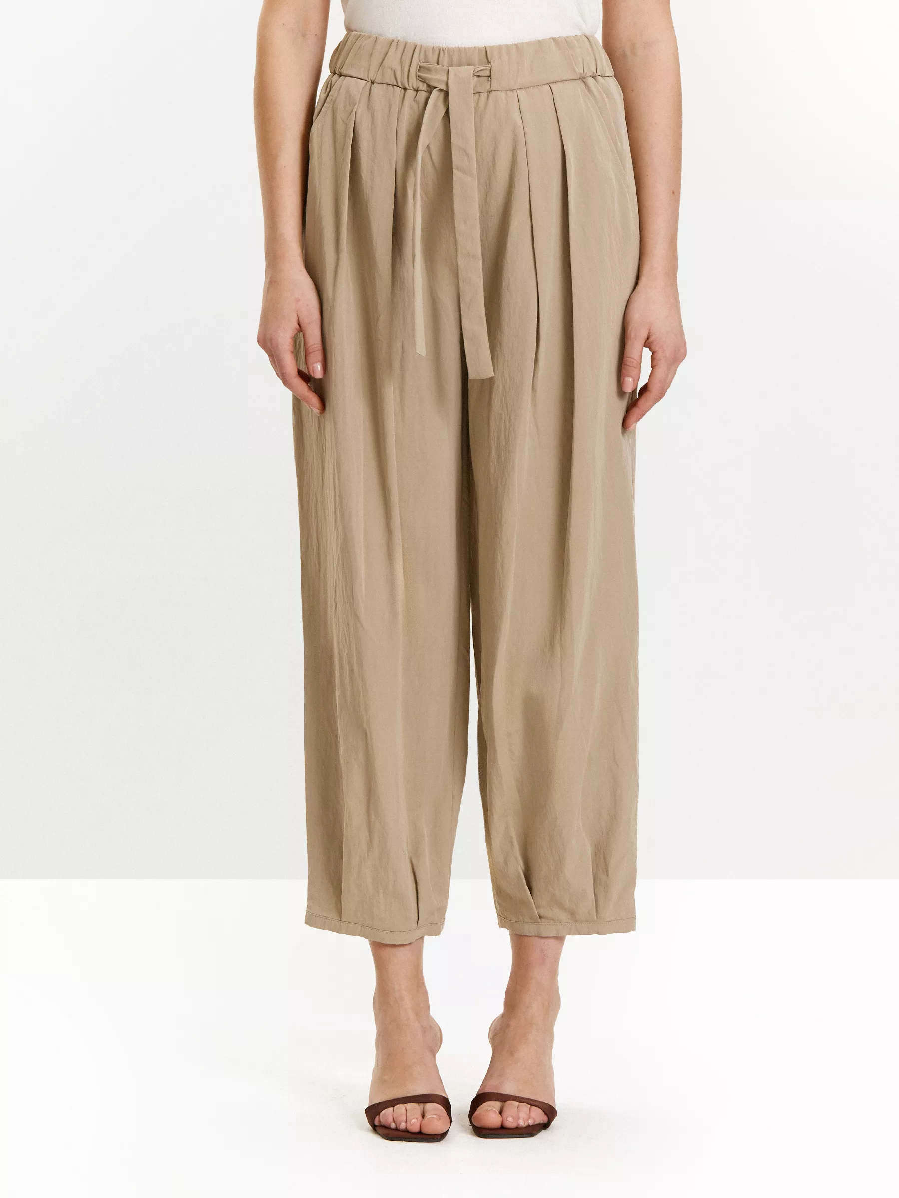 Модель отличают элегантные защипы на бёдрах и в нижней части брючин. Сделана на широкой кулиске с завязкой-лентой. Её можно повязать разными способами под настроение.