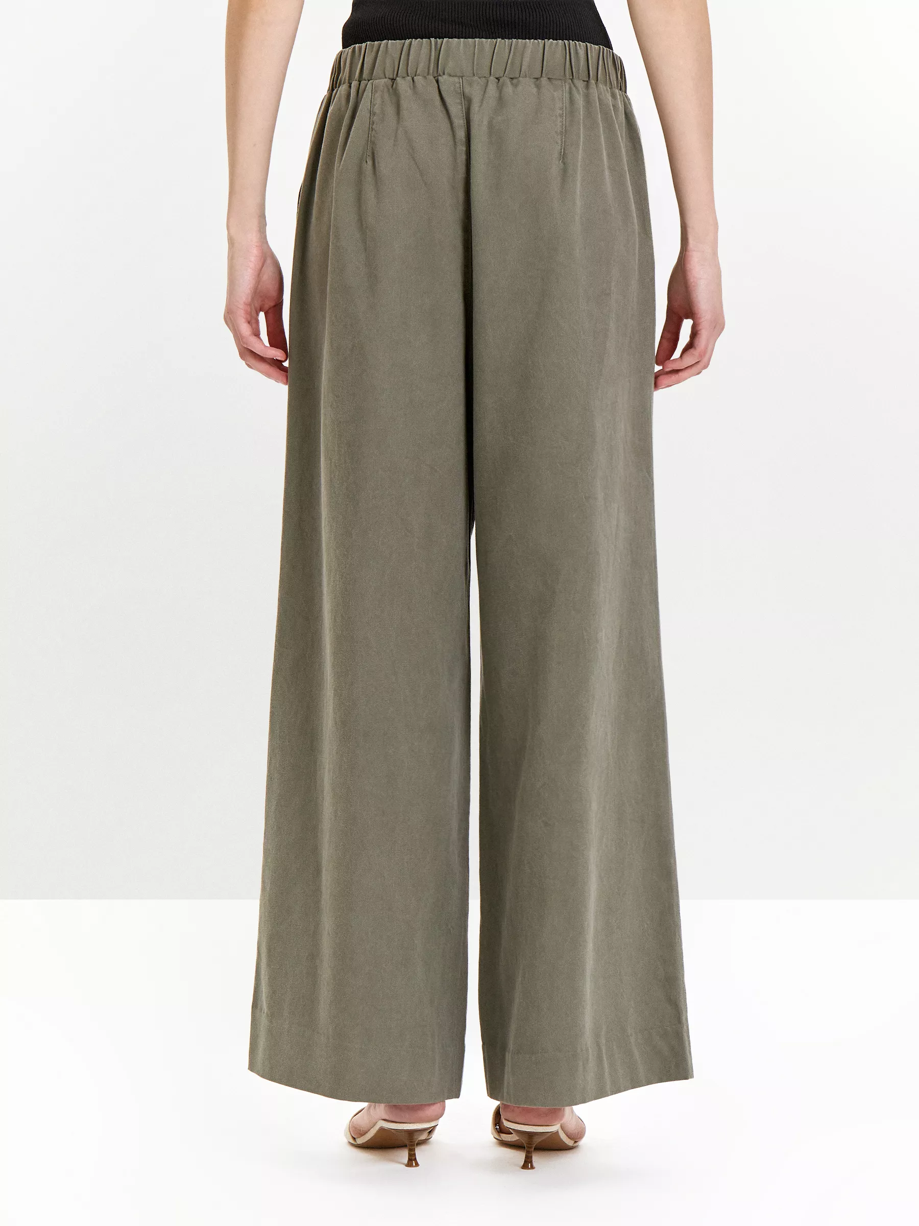 Свободные брюки на лето в цвете хаки отлично подойдут на любую погоду. Они сделаны из тенсела и хлопка, но обработаны под деним: стильно выглядит, приятно к телу.
