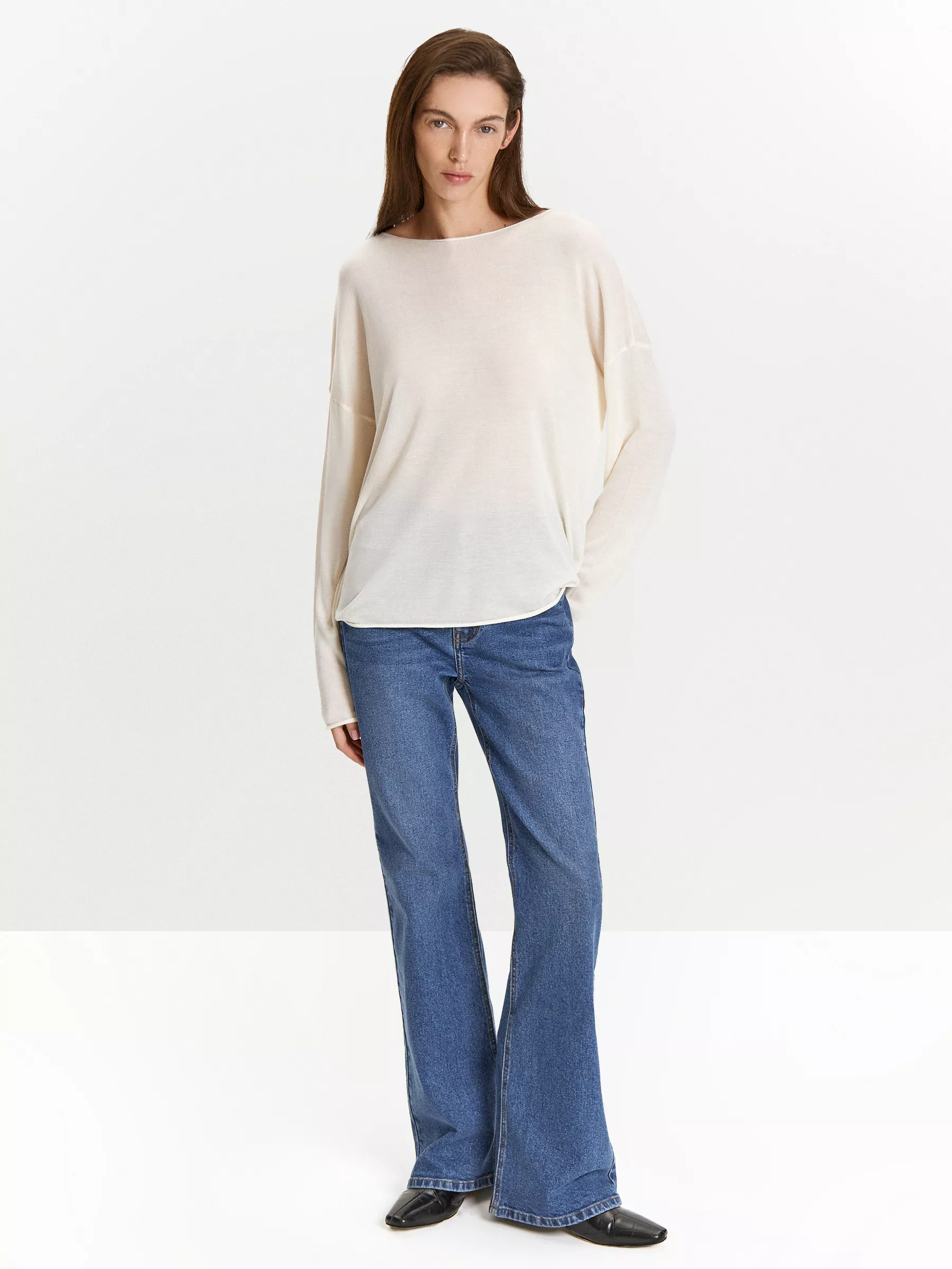 Деликатная прозрачность джемпера и необработанный край, свободная посадка, удлинённые рукава создают ощущение лёгкости. Оно особенно ценно в зимнем гардеробе. А элегантный фасон с вырезом-лодочкой делает вещь универсальной.