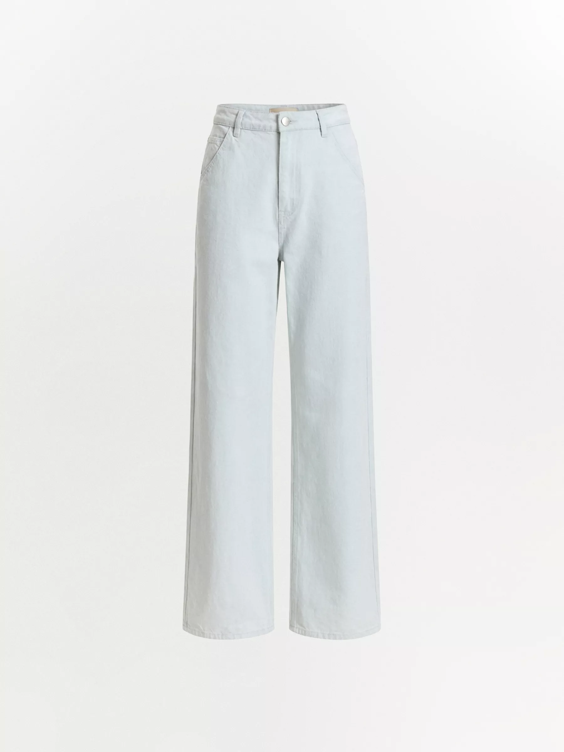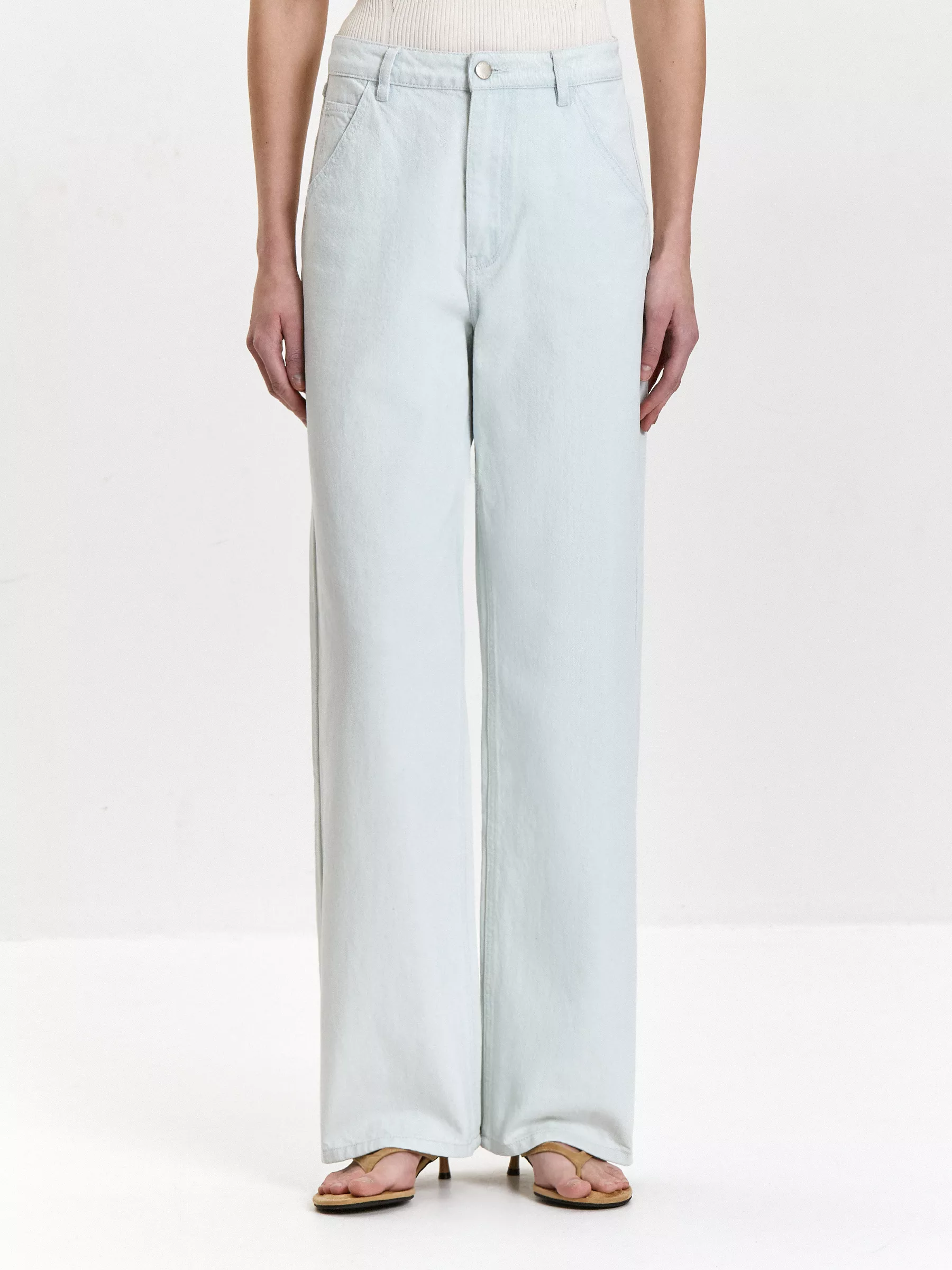 Джинсы прямого кроя светло-голубого цвета. Выполнены из прочного дышащего хлопка. Спереди имеются два прорезных кармана и накладные сзади. Оснащены шлёвками для ремня. Джинсы можно дополнить трикотажным топом, яркой футболкой или базовой блузкой.