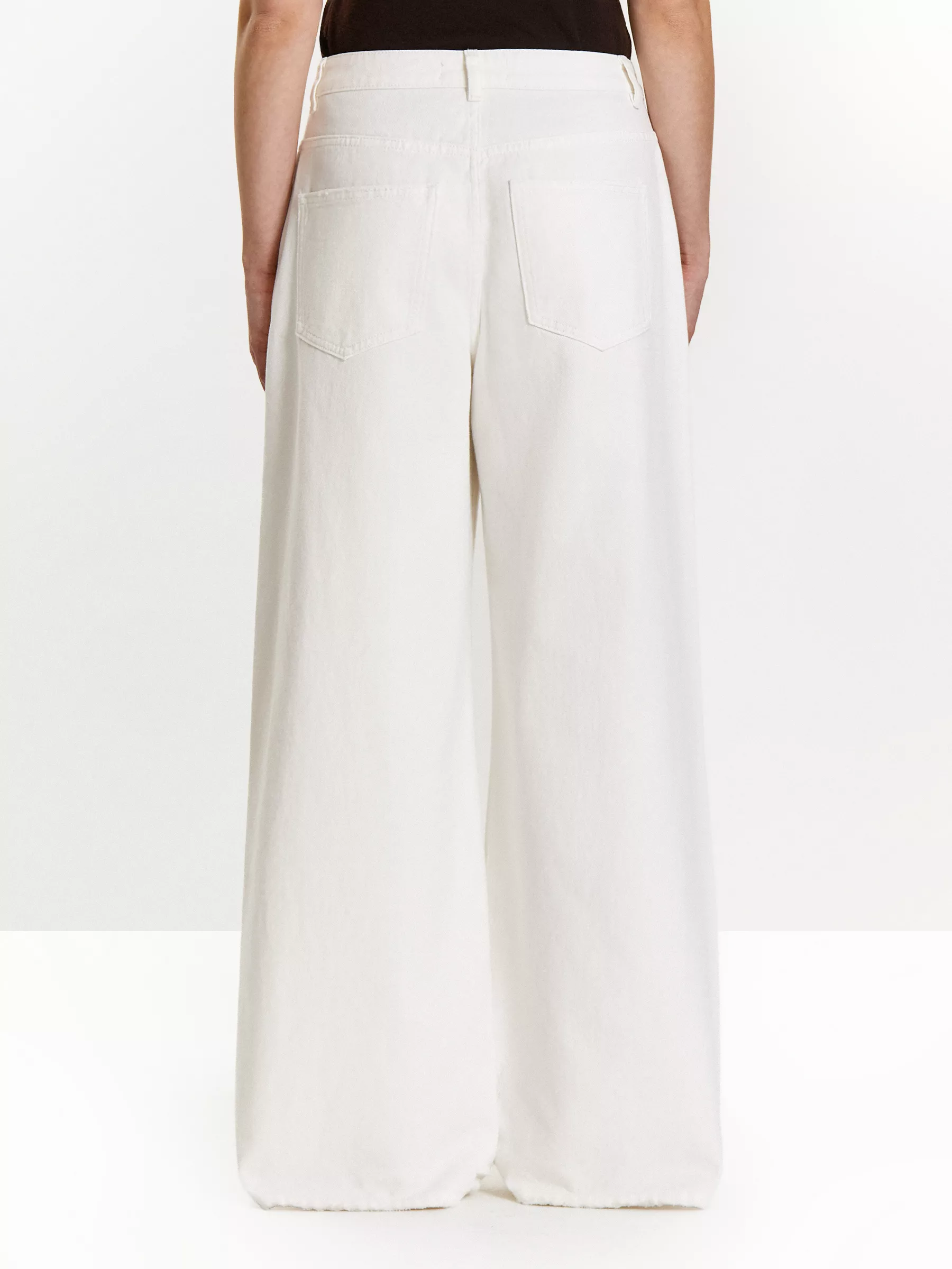 Широкие джинсы в белом цвете сделаны полностью из хлопка.