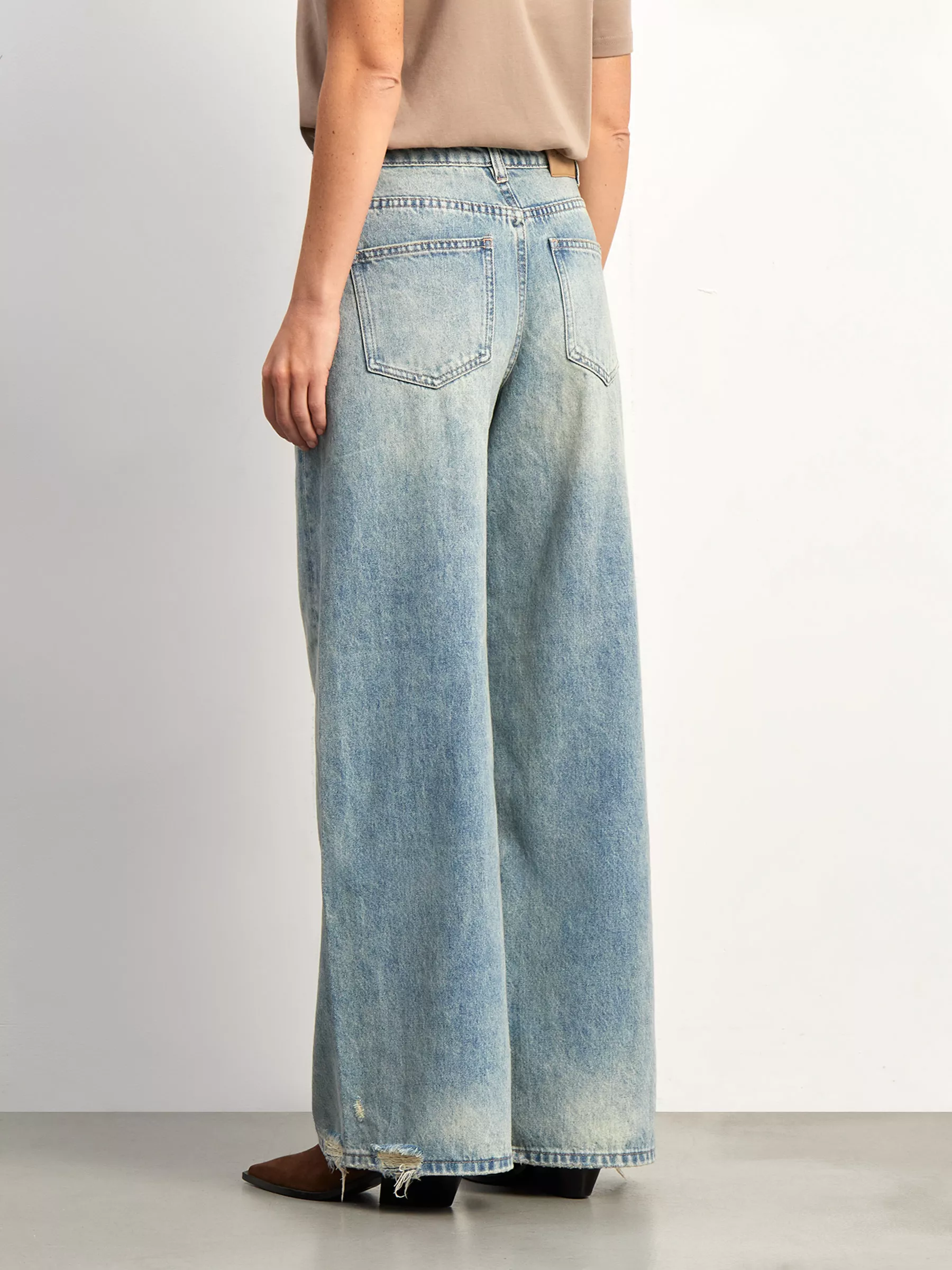 Широкие джинсы трендовой варки с вывернутым швом, модным рваным эффектом и потёртостями добавят гранжевый аккорд в повседневные образы. Выполнены из качественного хлопка в светло-синем цвете. Хорошо сочетаются с фланелевыми рубашками и базовым трикотажем.