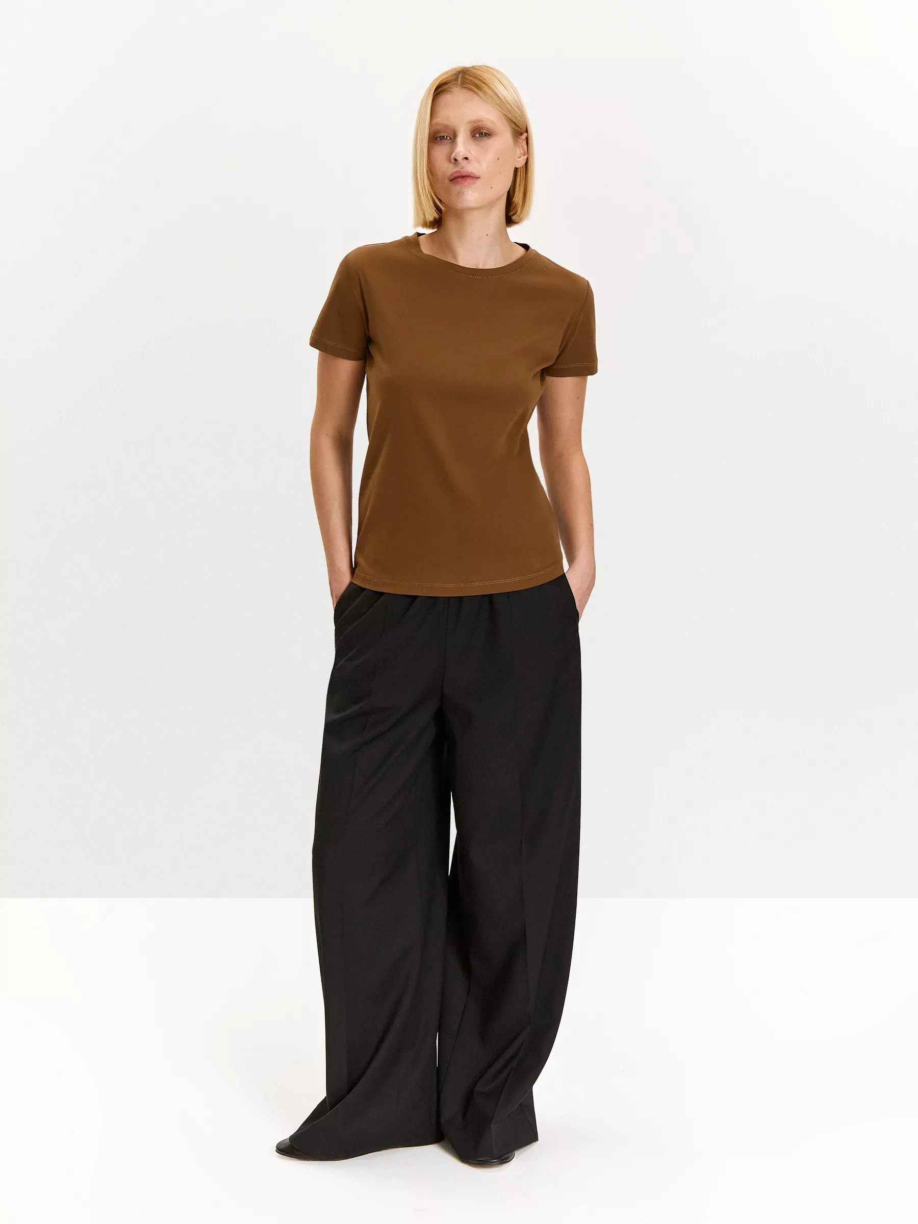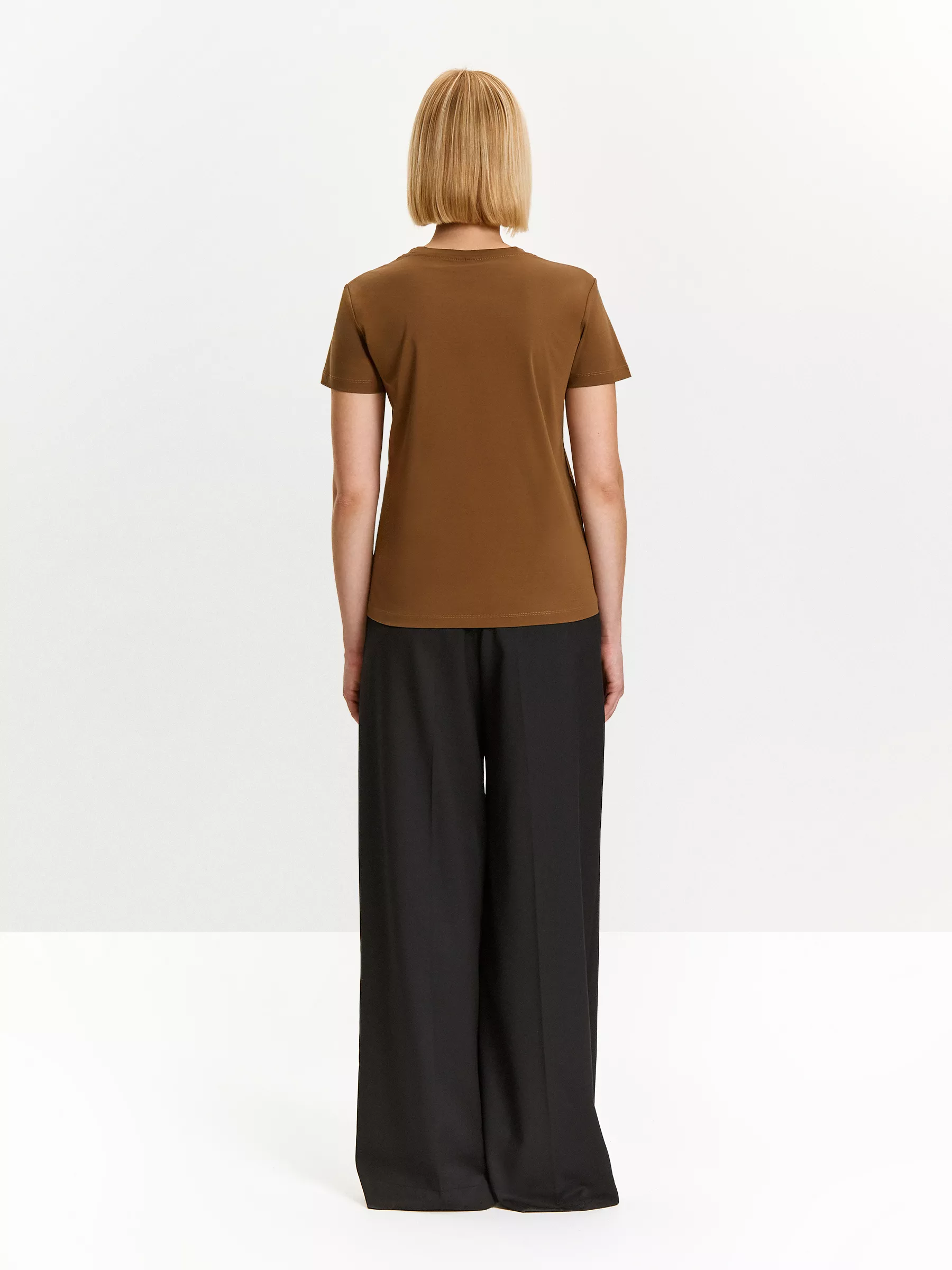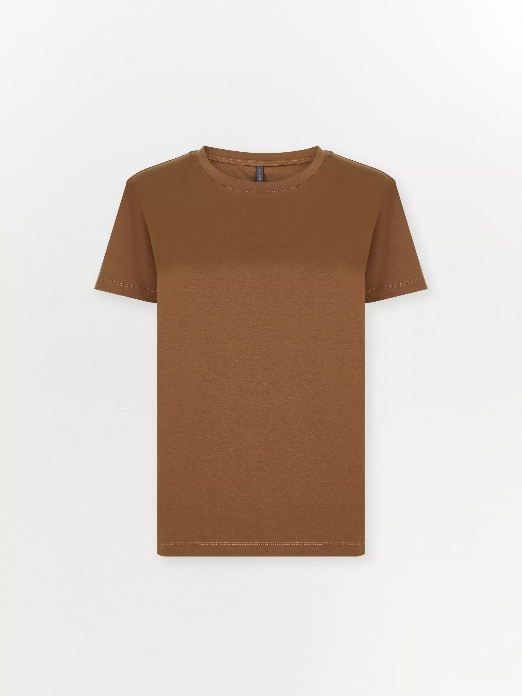 Трикотажная футболка коричневого цвета. Модель прямого силуэта с круглым вырезом выполнена из плотного хлопка. Универсальная длина позволяет носить изделие как навыпуск, так и в заправленном виде. Однотонная футболка станет незаменимой вещью в любом гардеробе.