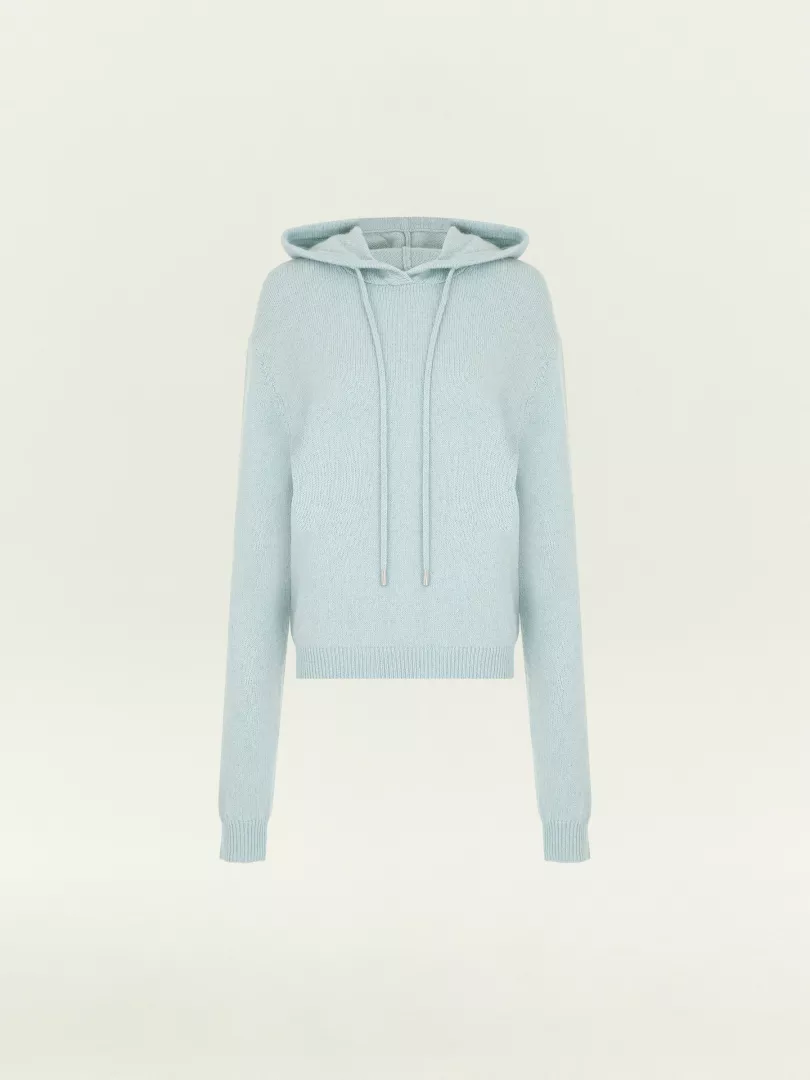 Худи в светлом серо-голубом оттенке для уютных образов на каждый день. Тонкий, но тёплый материал более чем на 2\3 состоит из натуральной шерсти. Не колется, приятно ощущается на теле. Капюшон дополнен длинными шнурками.