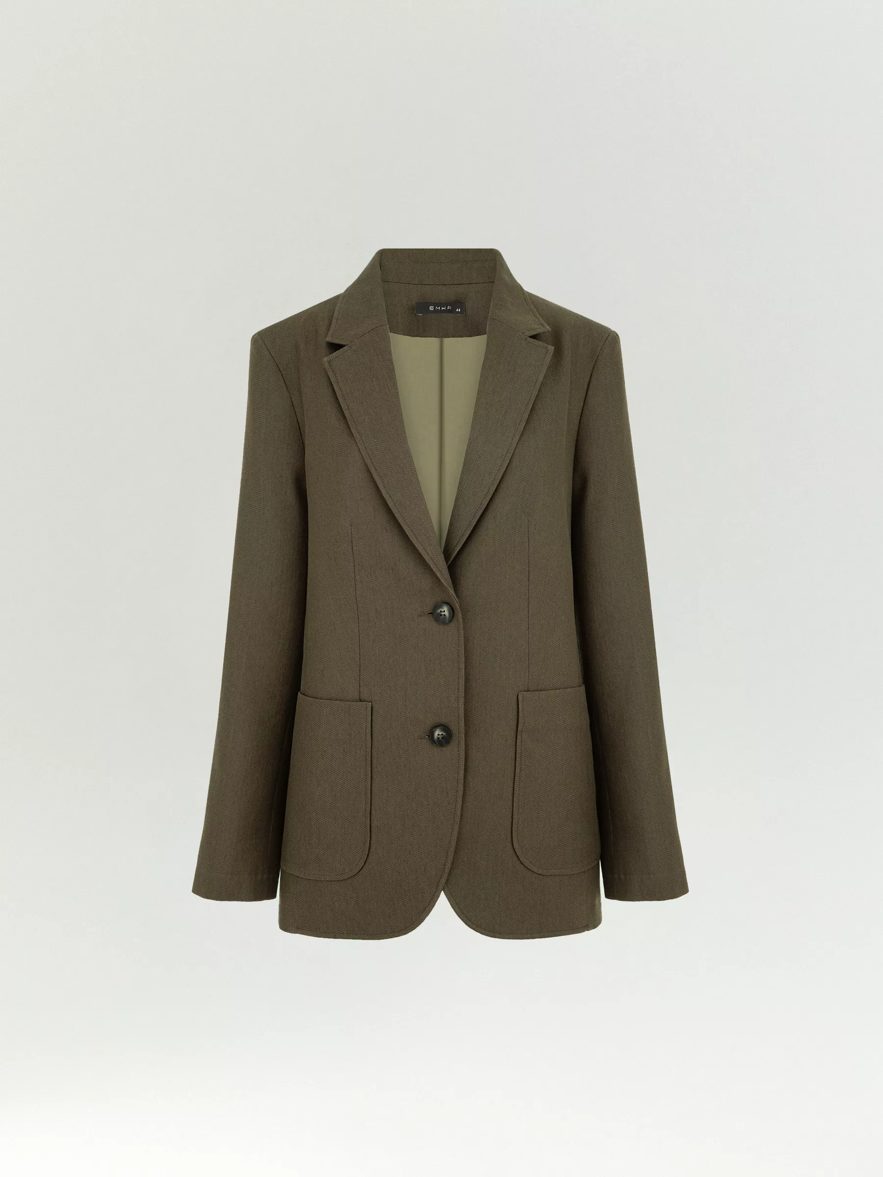 Жакет цвета хаки из тенсела и льна. Модель прямого кроя дополнена английским воротником, крупными накладными карманами и пуговицами под рог. Изделие изготовлено на подкладке с хлопком. Дополнить образ можно брюками из комплекта.