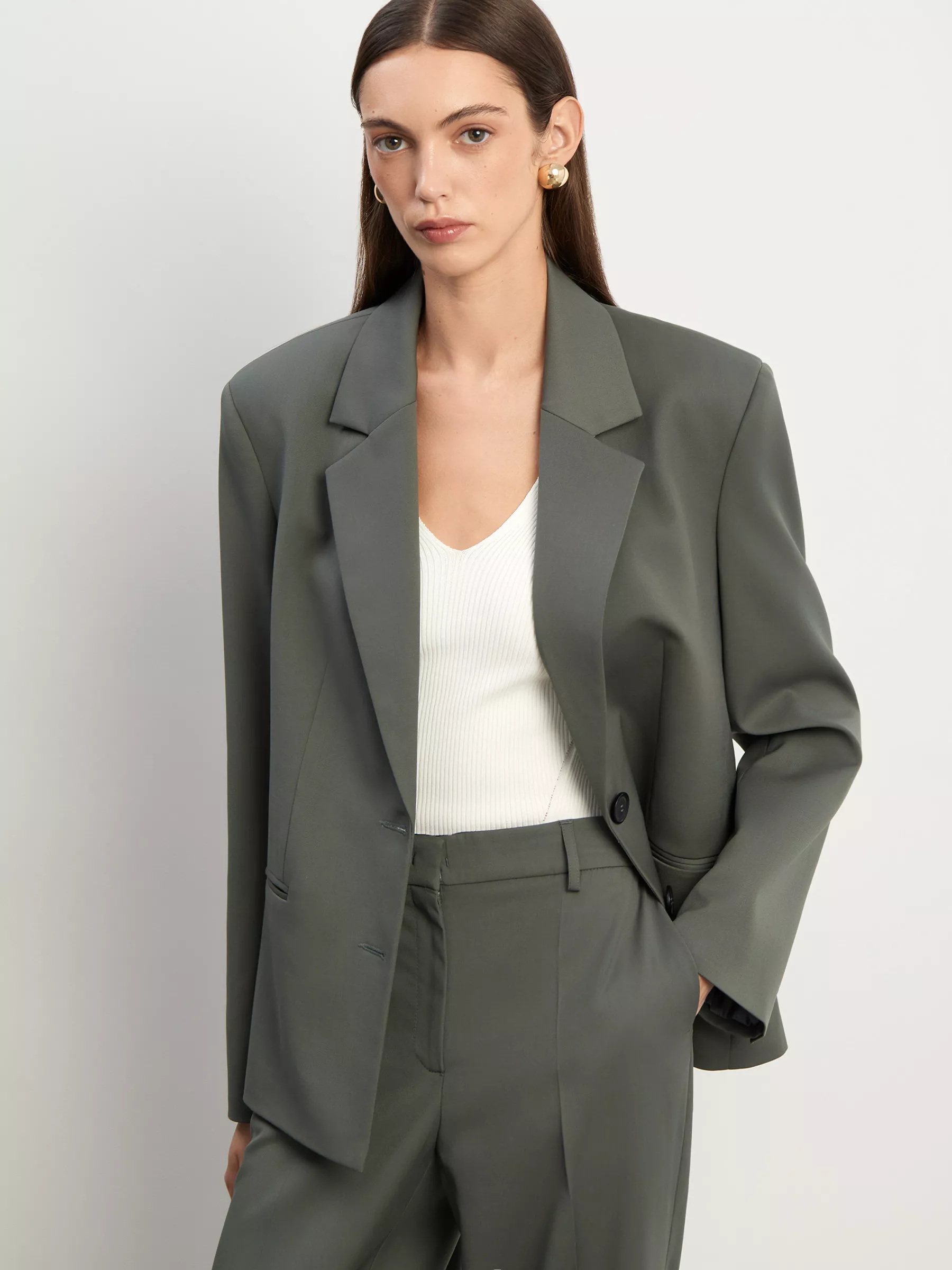 Жакет цвета хаки для модных повседневных образов. Выполнен из материала с содержанием шерсти: её чуть меньше половины. Модель прямого кроя отличают расширенная линия плеч и дополнительный объем в этой области. Однобортную модель также дополняют английский воротник и узкие карманы с листочкой. Завершить образ с жакетом можно брюками из комплекта.