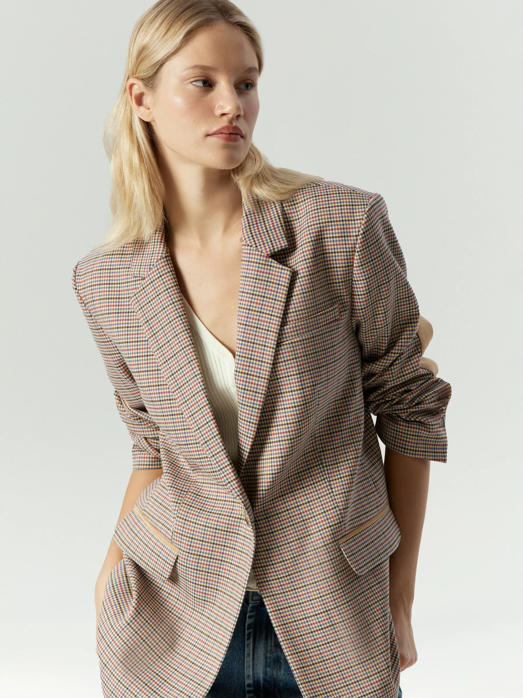 Жакет с принтом "гусиная лапка" станет универсальным вариантом второго слоя ко множеству образов. Принт сочетает в себе несколько оттенков в палитре года: голубой, коричневый, красный и оранжевый, что делает его очень удобным в подборе образов. Он будет сочетаться со многими вещами в гардеробе. Модель дополнена подплечниками и вставками из замши: на внутренней стороне воротника, на локтях, на карманах. Изделие изготовлено на подкладке.