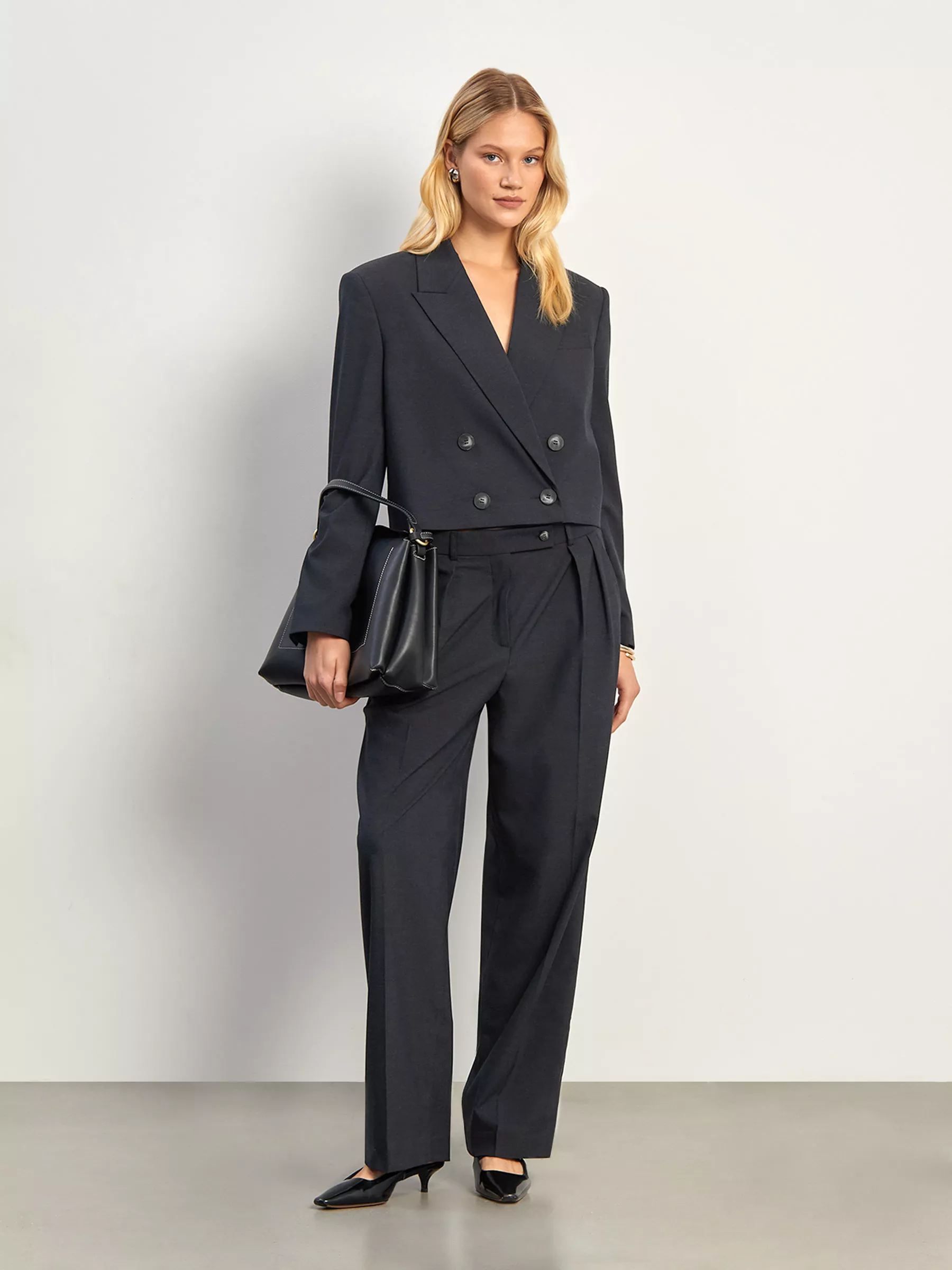 Укороченный двубортный жакет выполнен в сложном, интересном оттенке: синее-серый меланж. Этот цвет идеален для офисных образов. Материал с содержанием вискозы хорошо подходит на межсезонье. Дополнить образ можно брюками из комплекта. Жакет выполнен на подкладке.