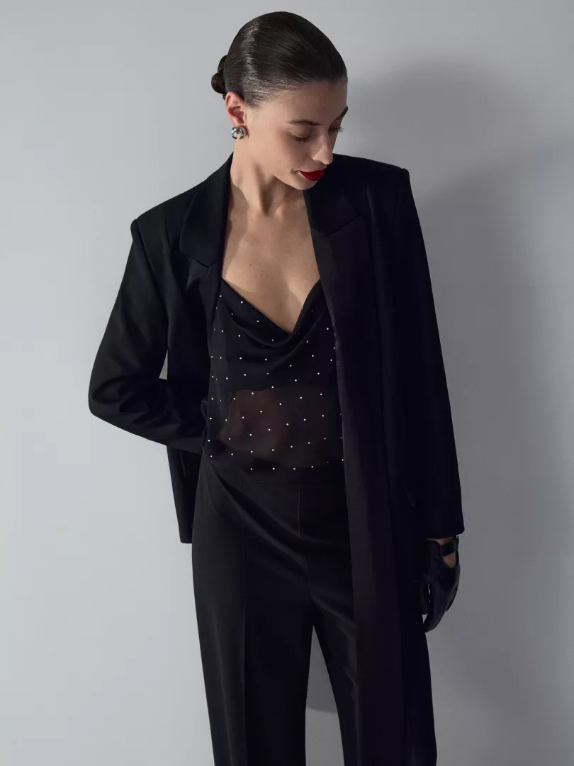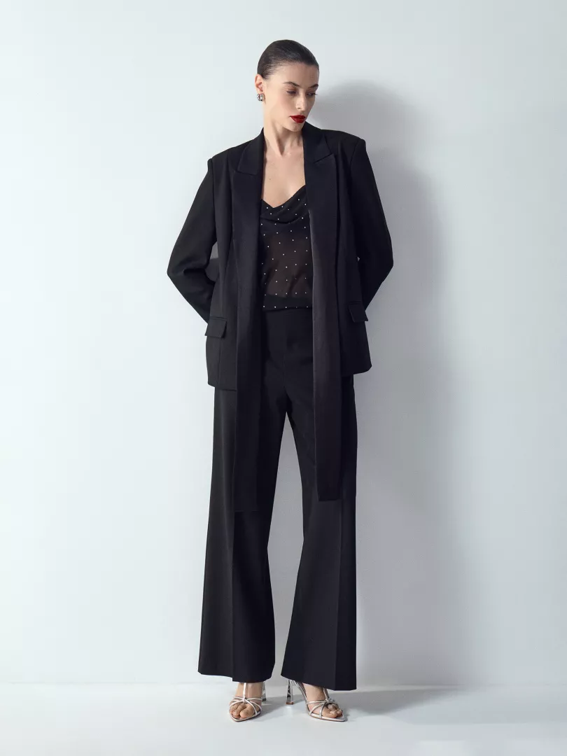 Жакет-смокинг с удлинёнными атласными лацканами поможет создать необычный образ на базе делового стиля. Лацканы можно красиво завязать разными способами: например, здесь особенно уместен приём с кольцом. Дополнить жакет можно брюками из комплекта.