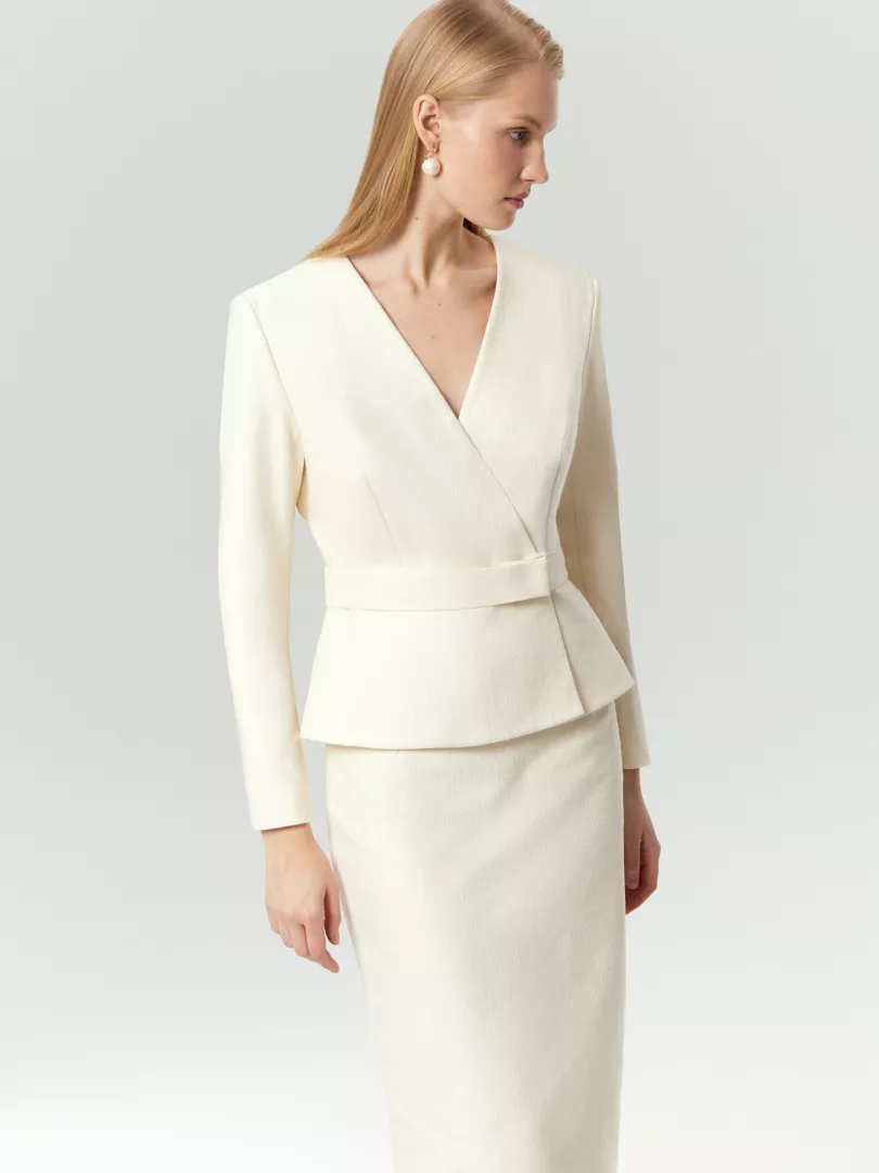 Укороченный жакет с V-вырезом и эффектом баски создаст благородный образ в стиле lady like. Модель без лацканов, с широкой отрезной частью и поясом на потайной застёжке смотрится очень элегантно. Приятный на ощупь твид сделан из хлопка с добавлением вискозы и эластана для сохранения формы. Это комфортный вариант на демисезон и не только. Жакет выполнен на подкладке с высоким содержанием вискозы. Завершить образ с жакетом можно юбкой из комплекта.