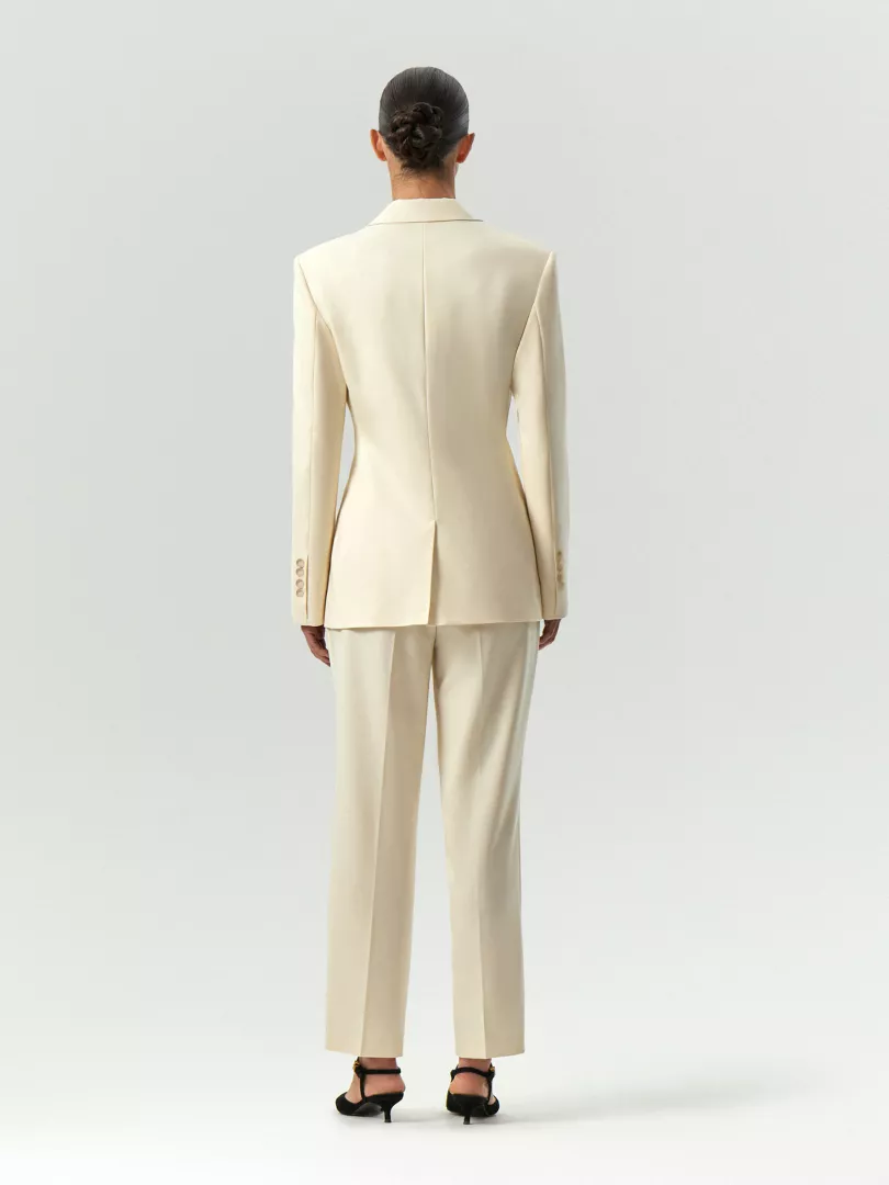 Приталенный жакет в молочном цвете отлично подойдёт и для особых случаев, и на каждый день. Материал из тонкой шерсти и мягкой вискозы с эластаном смотрится премиально, даёт комфортную посадку по фигуре. Модель на одной пуговице отличается приятным сочетанием острых лацканов и скруглённых бортов. Расположенные под углом карманы с клапанами подчёркивают женственный переход от талии к бёдрам. Вытачки вытягивают силуэт. Аккуратные подплечники структурируют образ. Дополнить жакет можно брюками из комплекта.