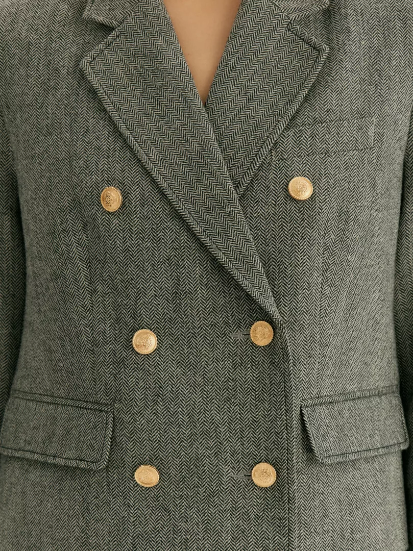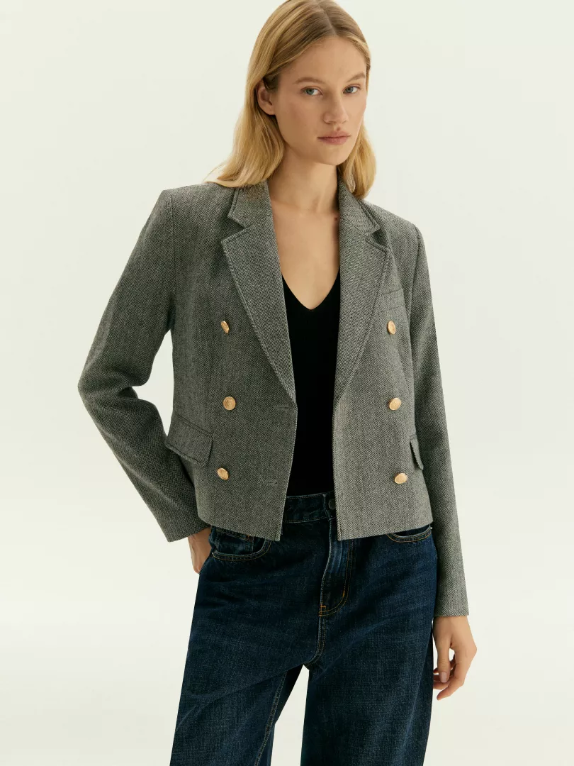 Двубортный укороченный жакет подойдёт для демисезонных и зимних образов, а также на прохладное лето. Материал средней плотности почти на 2/3 состоит из натуральной шерсти, под ним — дышащая подкладка с высоким содержанием вискозы. Жакет в ёлочку выполнен в элегантном сером цвете. Акцентом образа станут яркие золотистые пуговицы с чеканкой: акцентная фурнитура — один из заметных трендов года. Расположение пуговиц подчёркивает, как силуэт сужается к талии. Жакет будет сочетаться с любым денимом, особенно серым, бежевым или голубым.