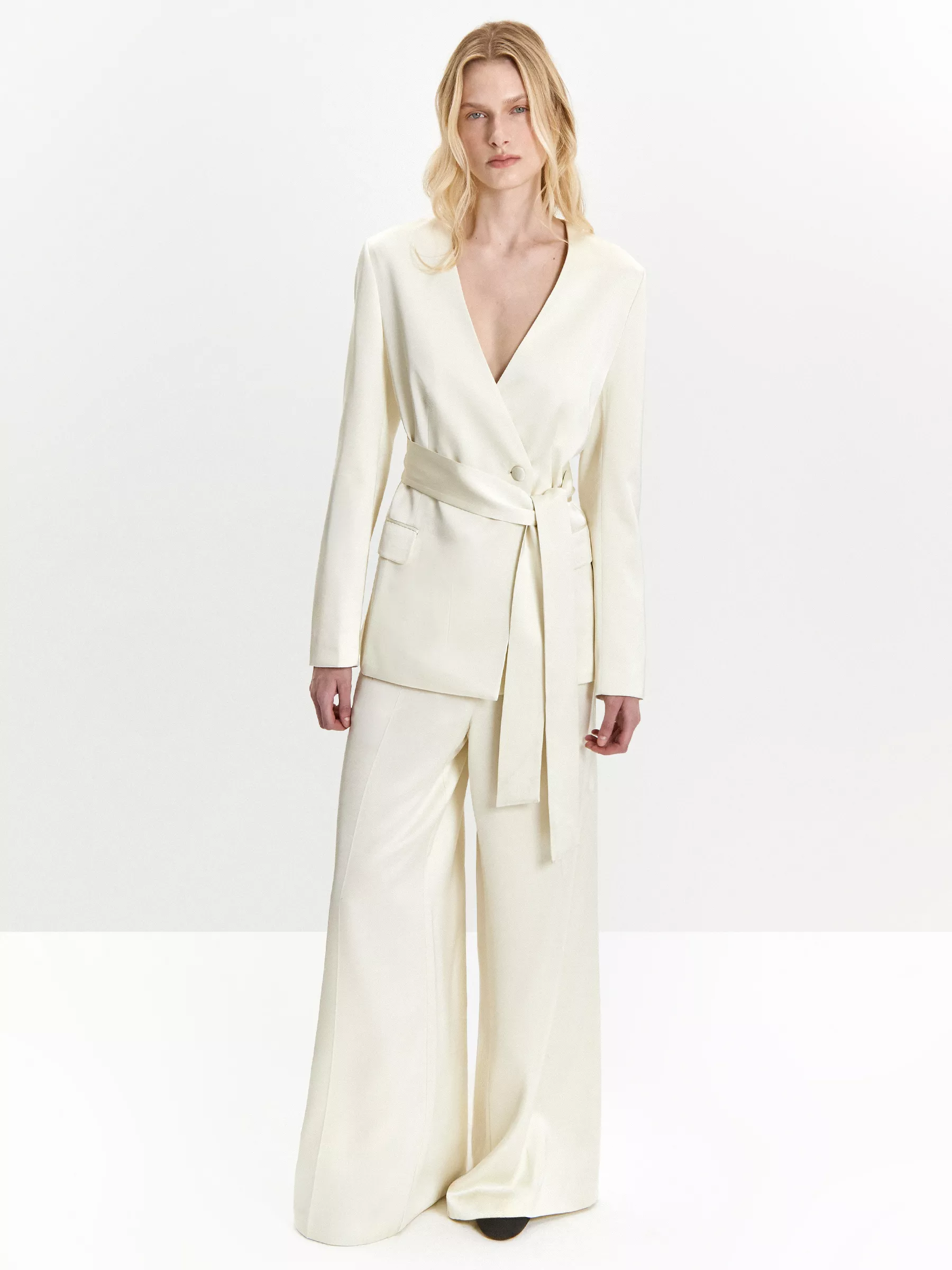 Завершить образ с жакетом можно роскошными атласными брюками из комплекта.
