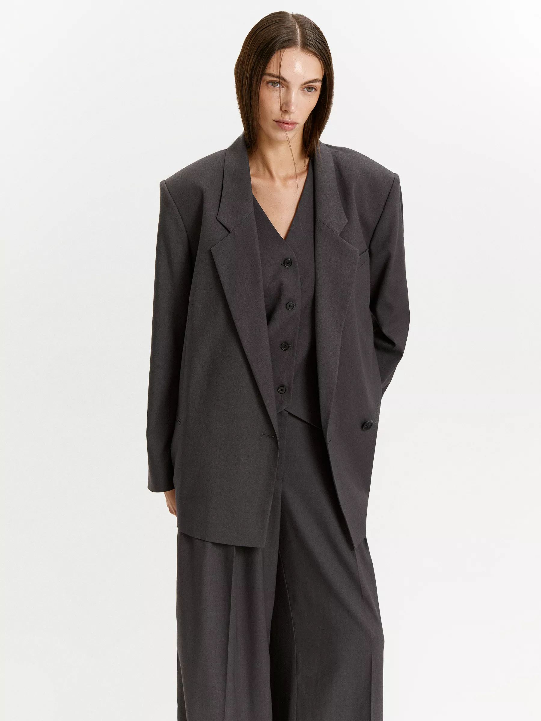 Жакет в сером цвете можно дополнить стильным жилетом и брюками из комплекта.