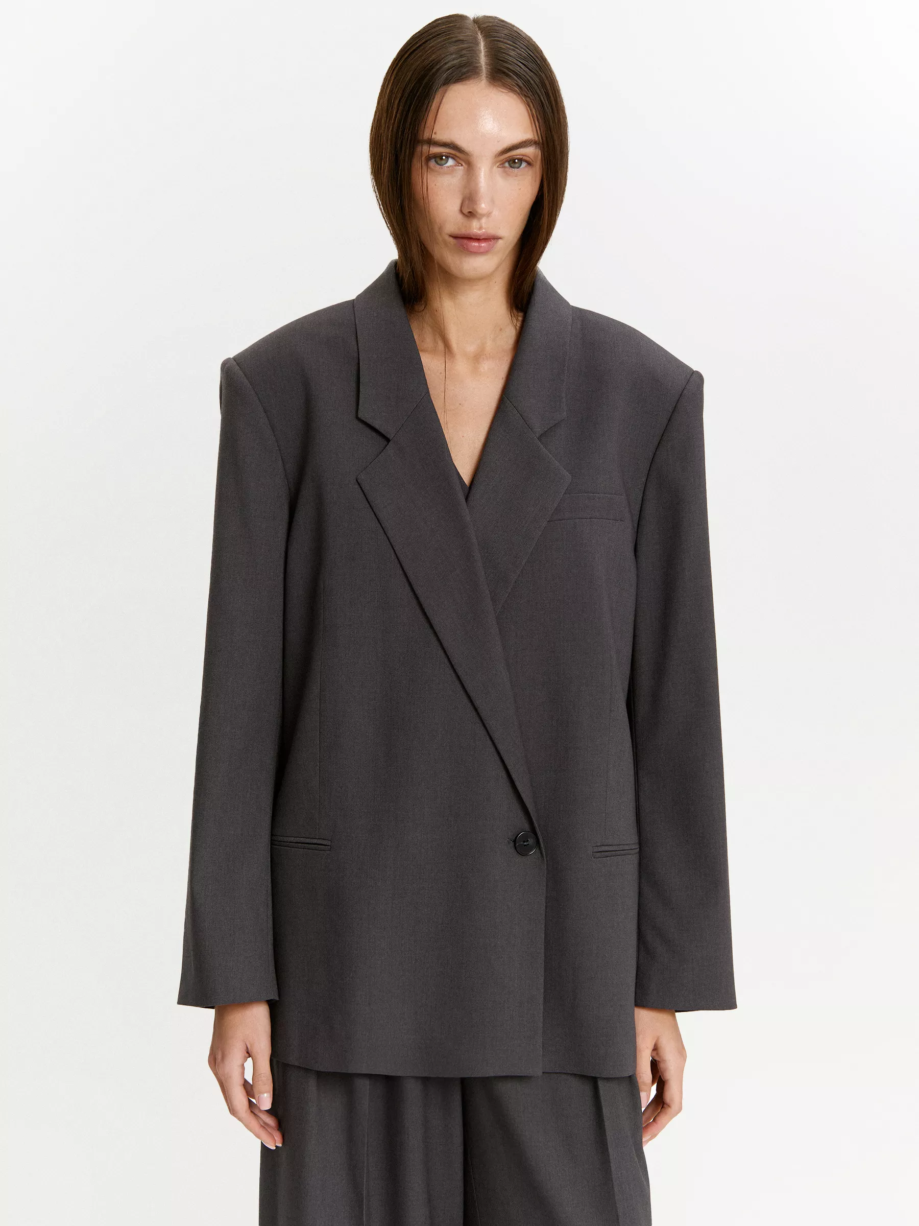 Удлинённая прямая модель с асимметричным запахом застёгивается на одну пуговицу ниже уровня талии. На одной линии с пуговицей находятся узкие карманы с листочкой. Имеются крупные подплечники.