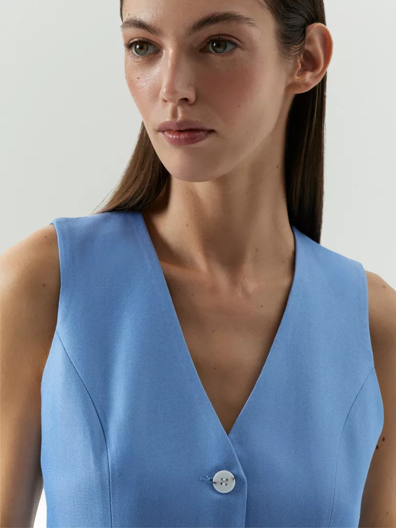 Жилет в притягательном голубом цвете подойдёт как для будней, так и особых случаев. Приталенную модель отличает фигурная линия борта со скошенным уголком. Вытачки изящно подчёркивают фигуру. Жилет застёгивается на 4 крупные пуговицы в тон. Спереди расположены два фальш-кармана с листочкой. Выполнен из приятного материала с высоким содержанием вискозы, на подкладке. С помощью жилета можно создавать интересные варианты с блузками, рубашками и трикотажными водолазками. Полный образ можно составить с брюками и жакетом из комплекта.