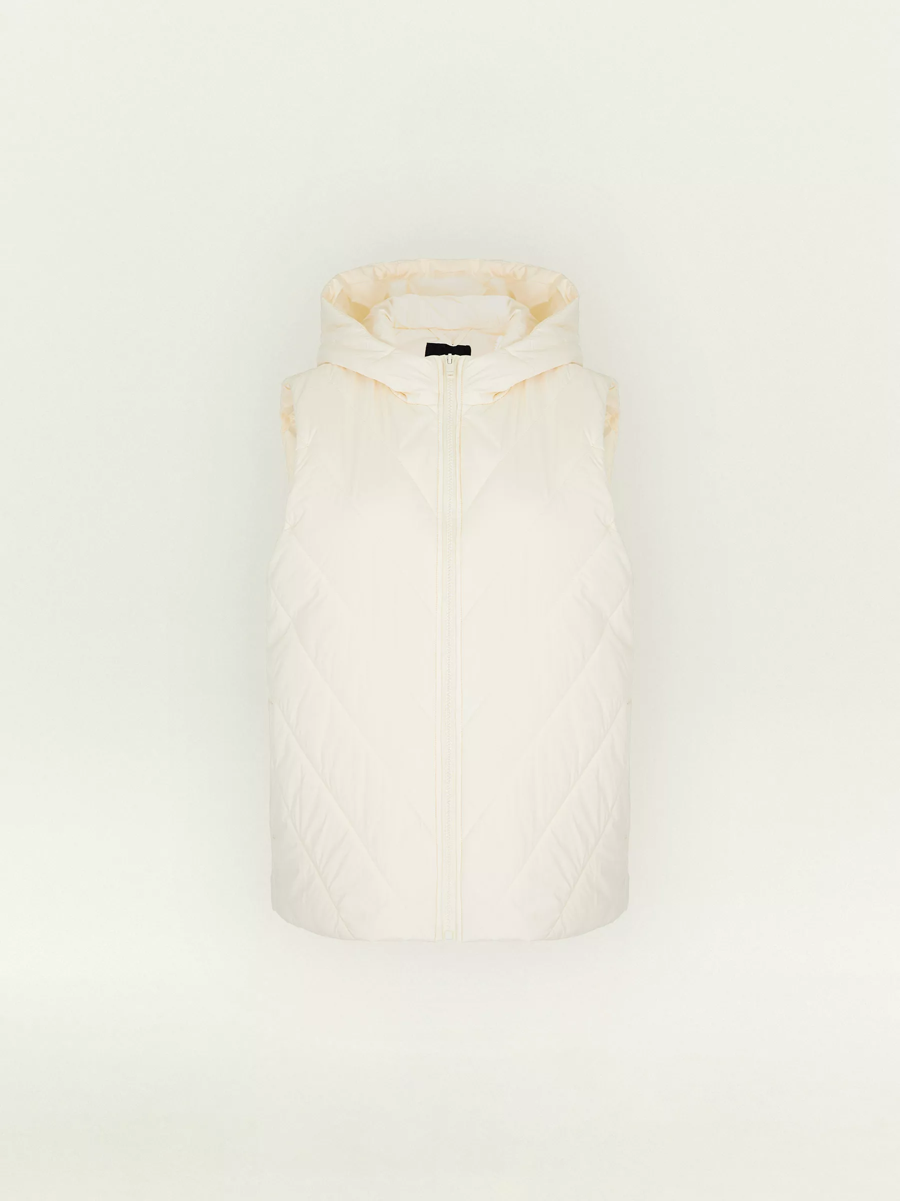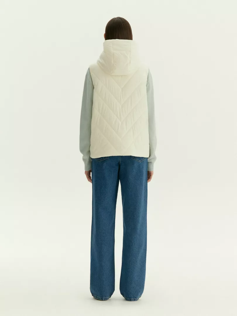 Мягкий стёганый жилет прямого кроя в универсальном молочном цвете. Модель без рукавов дополнена комфортным капюшоном. Имеет карманы по бокам. Застёгивается на удобную молнию. Жилет с синтепоновым наполнителем может выступать как самостоятельная верхняя одежда на прохладную погоду или как составляющая многослойного образа. Температурный режим до 5 °C