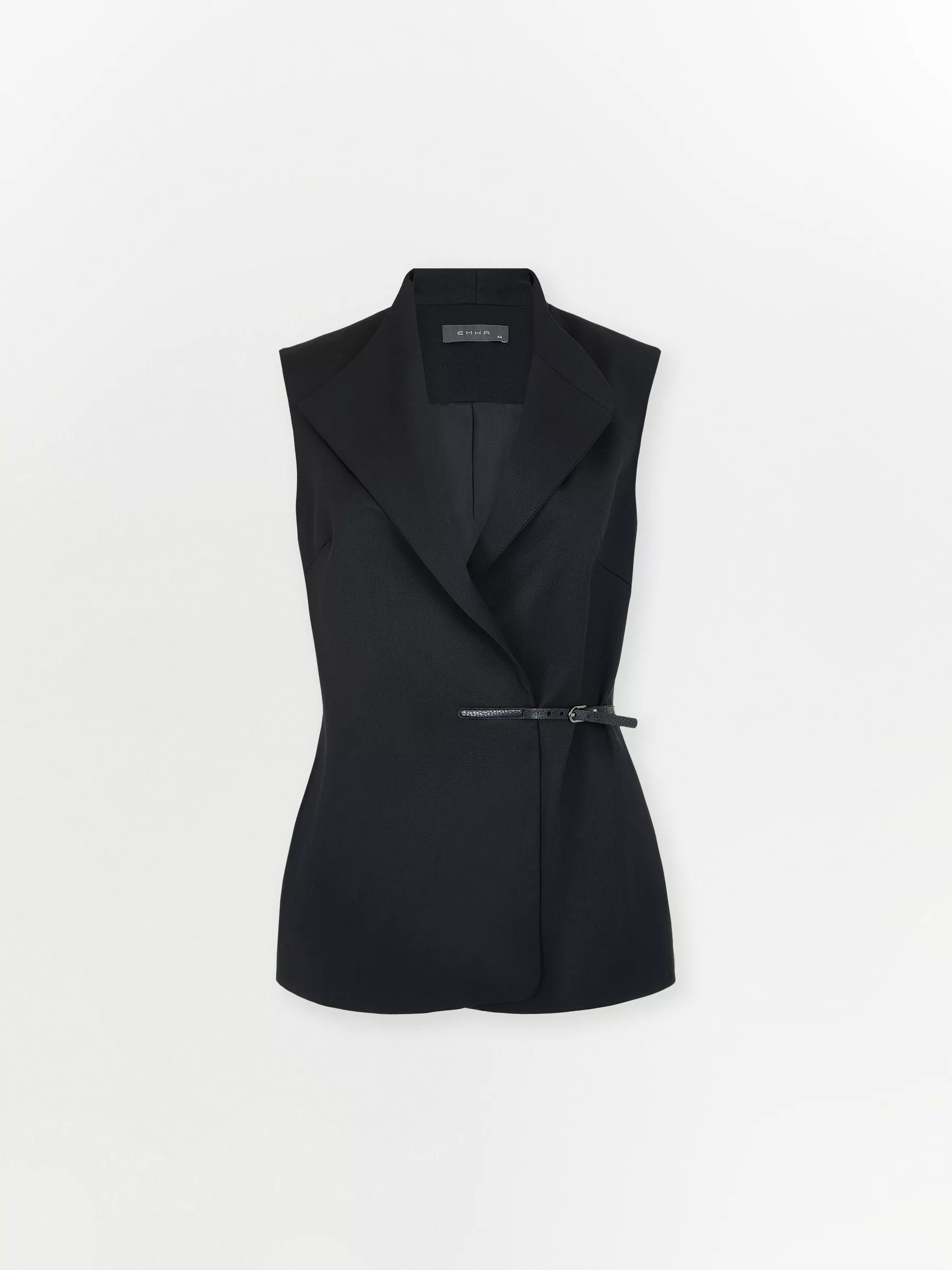 Модель отличает модное сочетание лацкана и стойки. Дизайн вдохновлён японским искусством оригами, поэтому лацкан похож на сложенный лист бумаги или отогнутый лепесток цветка. Жилет сделан с минимумом швов, чтобы образ стал визуально гладким.