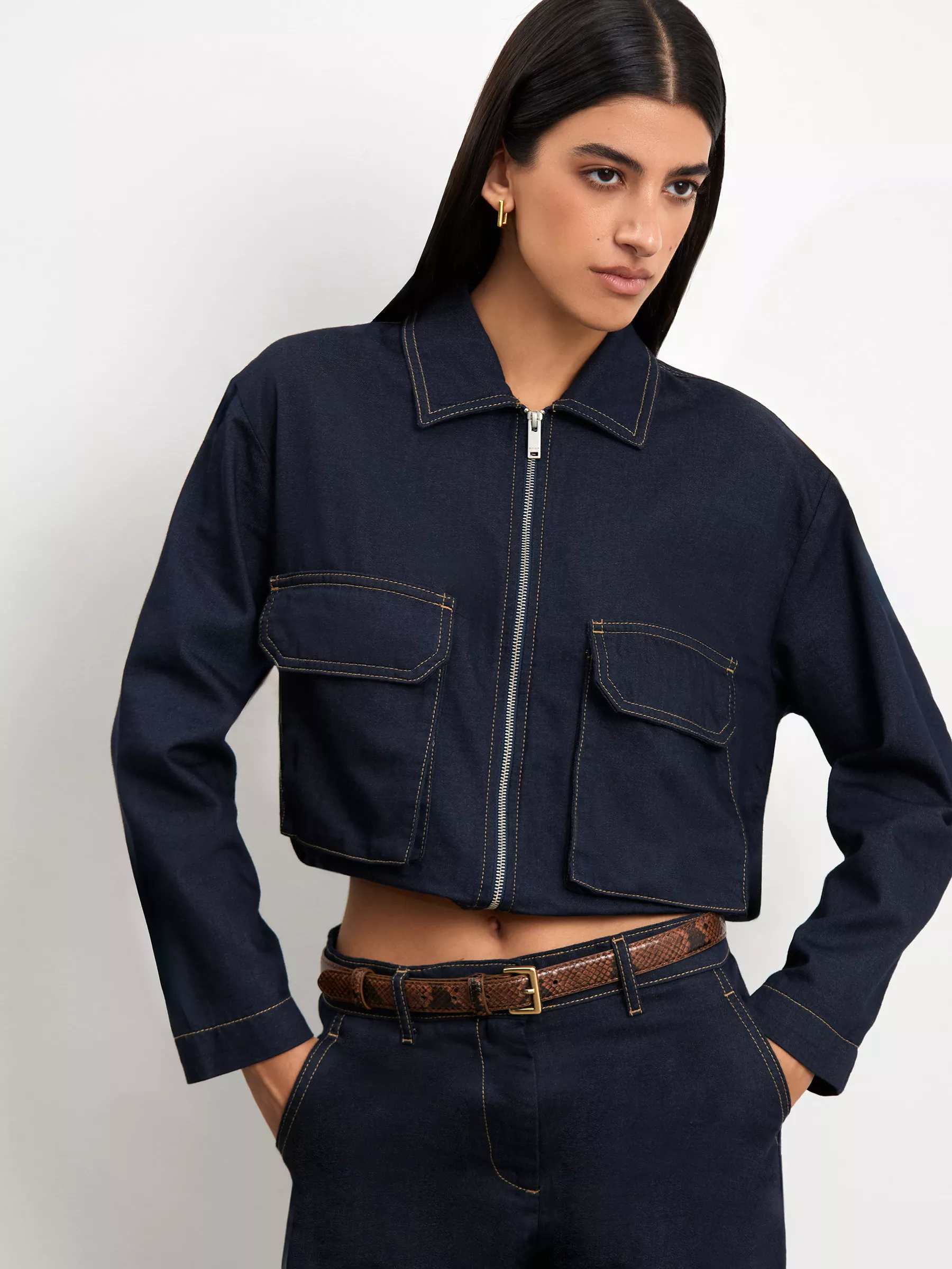 Плотная джинсовая куртка в тёмно-синем цвете отличается крупными карманами на груди и акцентной отстрочкой. Создаёт уверенный образ для повседневных дел. Завершить его можно джинсами из комплекта и трикотажным топом.