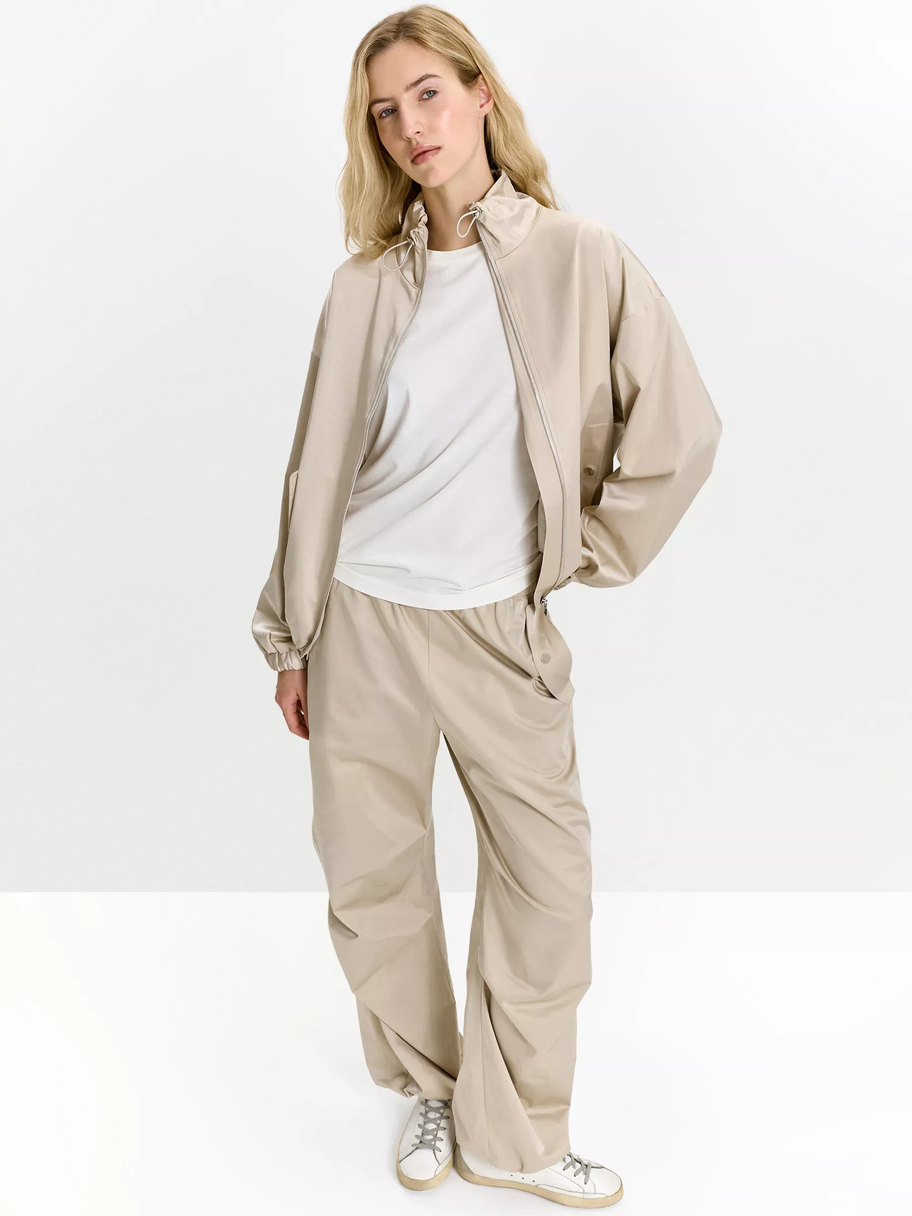 Трендовый бомбер в спортивном стиле. Хлопковая тафта сложного светлого оттенка в костюме — эффектное решение для повседневных образов. Модель отличается большим количеством продуманных деталей, которые делают образ интереснее и комфортнее. Карманы выполнены с дополнительными декоративными клапанами, а рукава — со сборкой на резинке. Силуэт позволяют трансформировать кулиски внизу и по горловине. Бомбер сделан на подкладке с хлопком. Завершить образ можно брюками из комплекта.