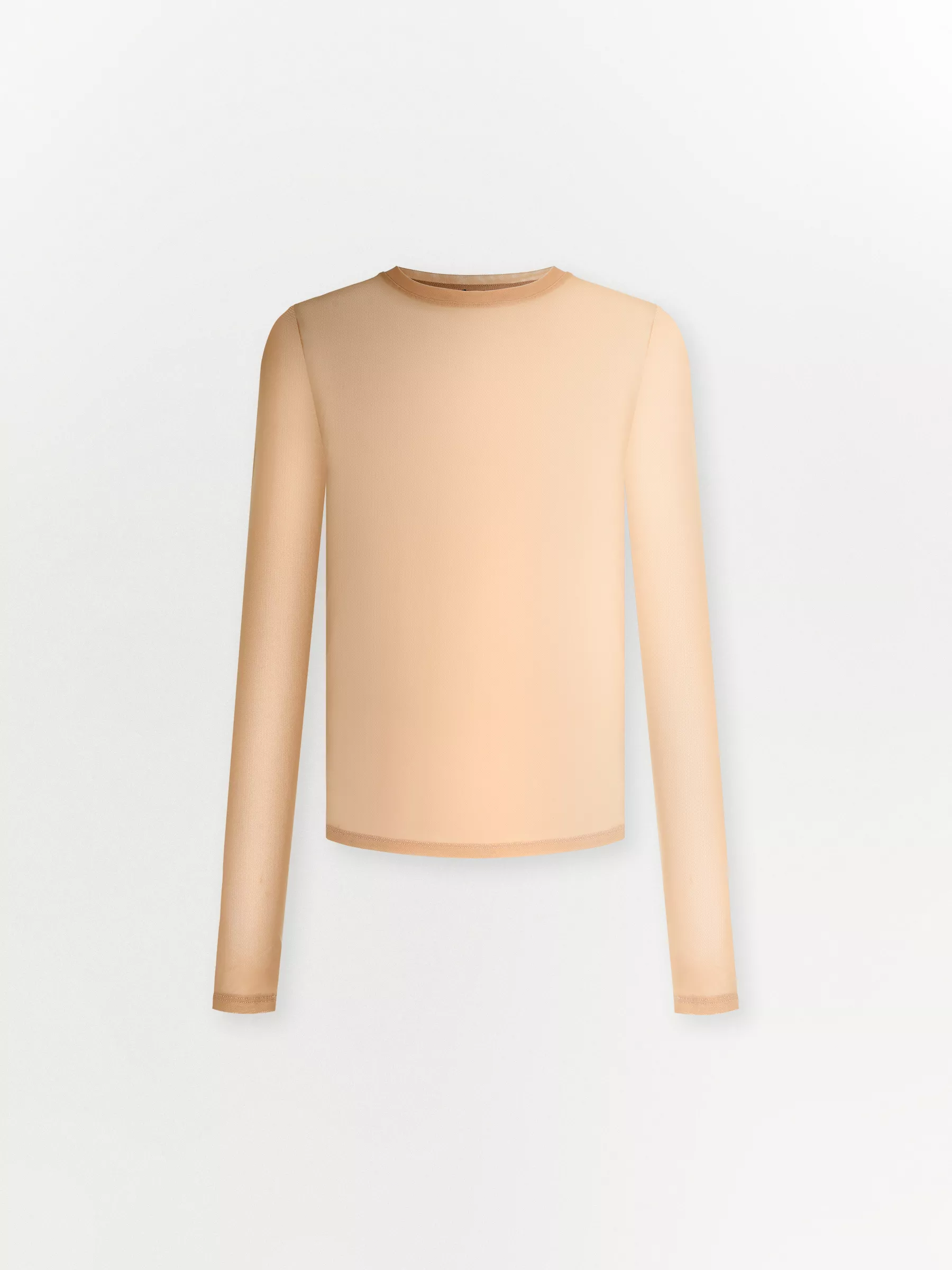Телесный, но с лёгким тоном "загара": очень летний вариант низа. Этот тонкий прозрачный лонгслив можно надеть под костюм, под сарафан или платье с открытыми руками. А можно — на короткий топ или боди без рукавов.