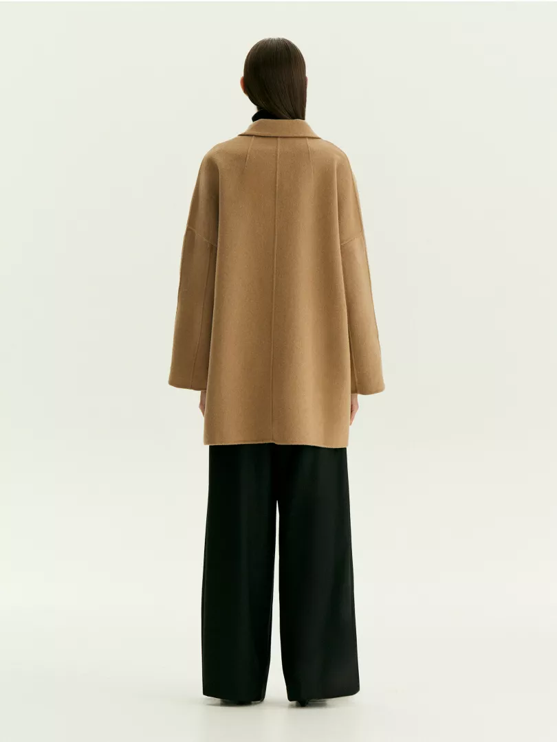 Элегантное манто в бежевом цвете смотрится современно и необычно. По бокам имеются разрезы. Предусмотрены специальные прорези для пояса. Материал более чем на 2/3 состоит из натуральной шерсти высокого качества и выполнен по технологии double-face: благодаря этому он дорого выглядит и отлично держит форму. Соединяли детали и прошивали пальто вручную: премиальное исполнение подтверждает вшивной ярлык hand made на рукаве. Пальто рассчитано на температуры до +5°C. Сделано без подкладки.