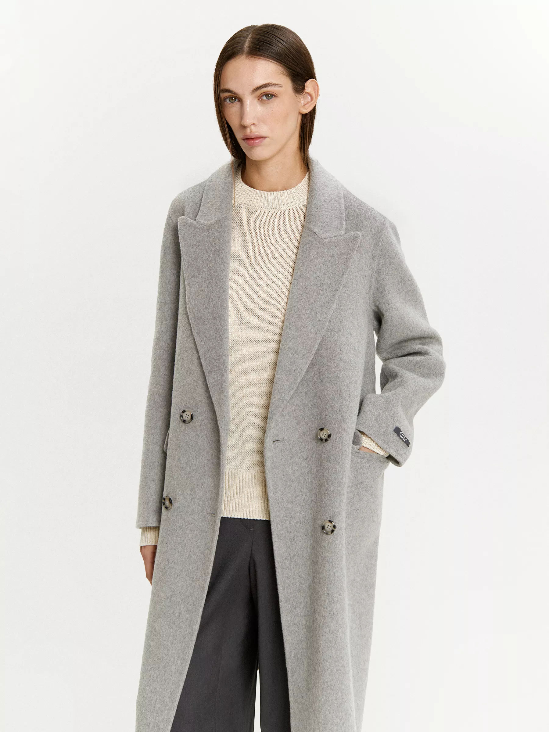 Соединяли детали и прошивали пальто вручную: премиальное исполнение подтверждает вшивной ярлык hand made на рукаве.