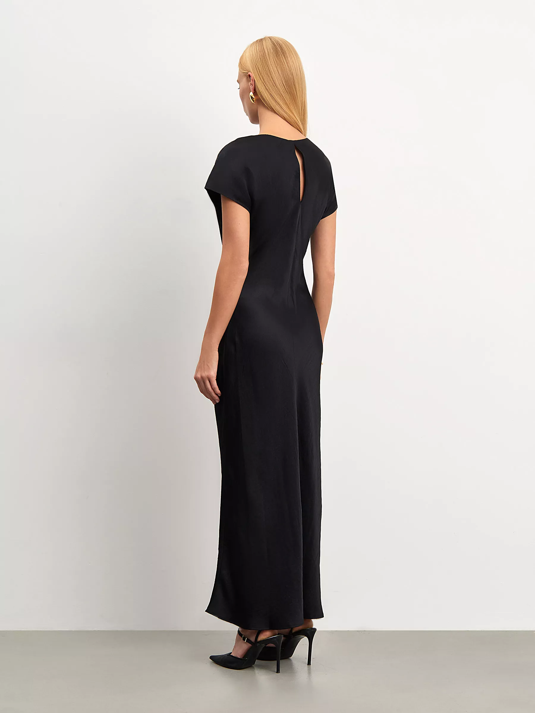 Платье в чёрном цвете для особых случаев и не только. Модель роскошно смотрится за счёт элегантного решения в крое рукавов, длины макси в сочетании с приталенным силуэтом, умеренного облегания и струящегося материала. Имеет лаконичный и комфортный круглый вырез. На спинке под застёжкой расположен узкий вырез-капля. Изделие застёгивается на аккуратную застёжку-крючок. Выполнено без подкладки.