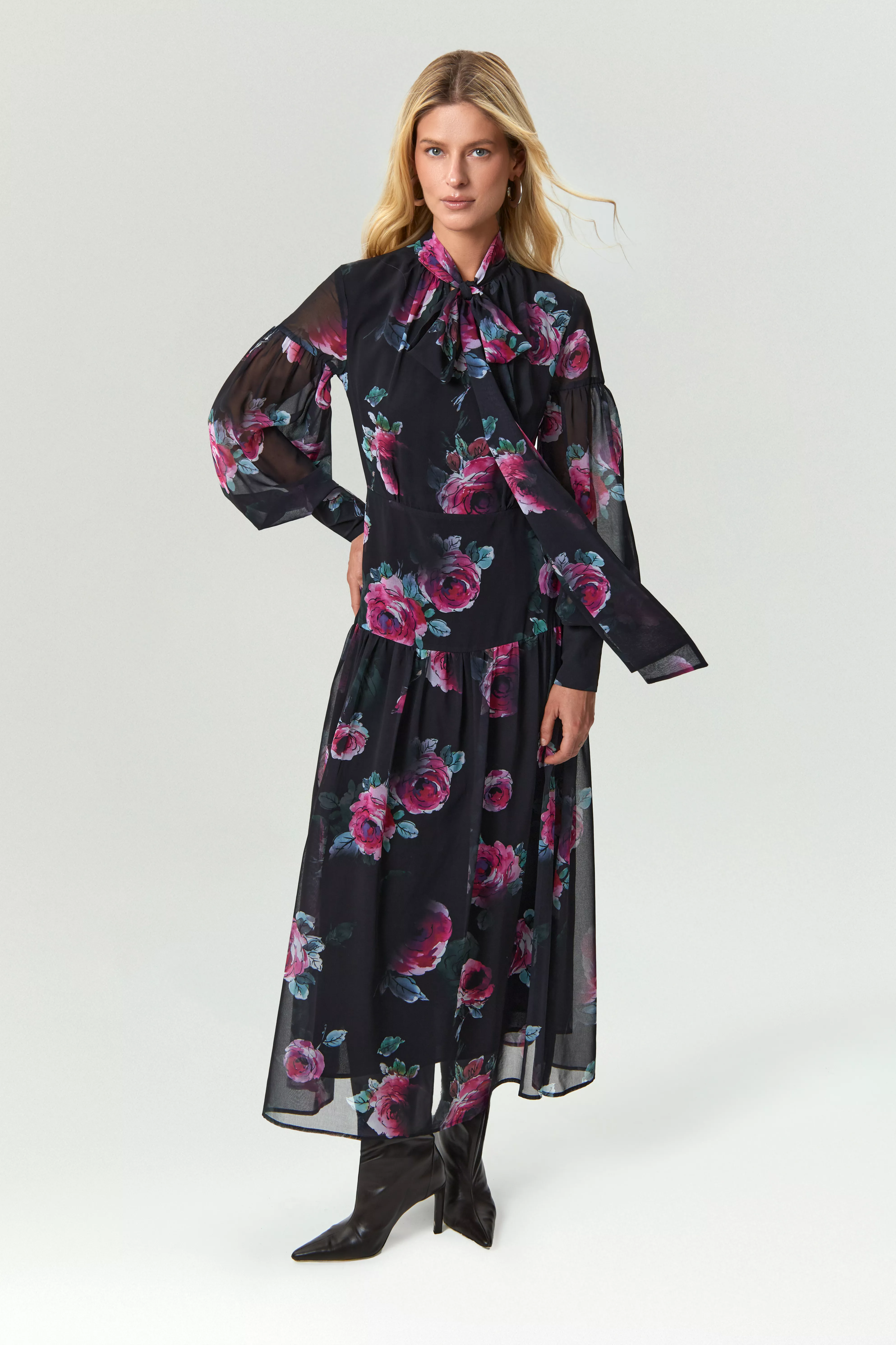 Нарядное шифоновое платье с крупным цветочным принтом порадует в будни и создаст настроение к особому случаю. Воротник-бант и сложный сборный рукав с широкими манжетами делает образ романтичным. Широкая отрезная часть между талией и юбкой красиво облегает фигуру. Платье поддерживает модный тренд на прозрачность. Выполнено с непросвечивающей подкладкой.