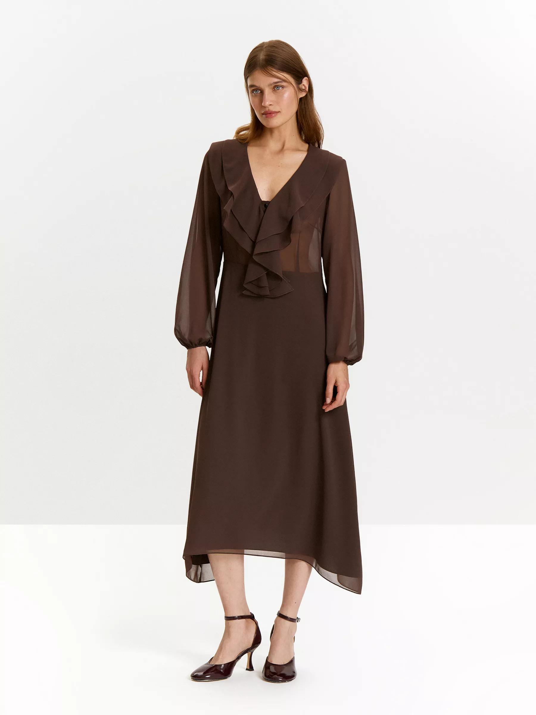 Платье сделано с частичной подкладкой: она присутствует на юбке. Лежащие на груди и плечах воланы, а также цвет мокко делают прозрачный верх допустимым. Также с платьем можно надеть лёгкий шёлковый топ в тон.