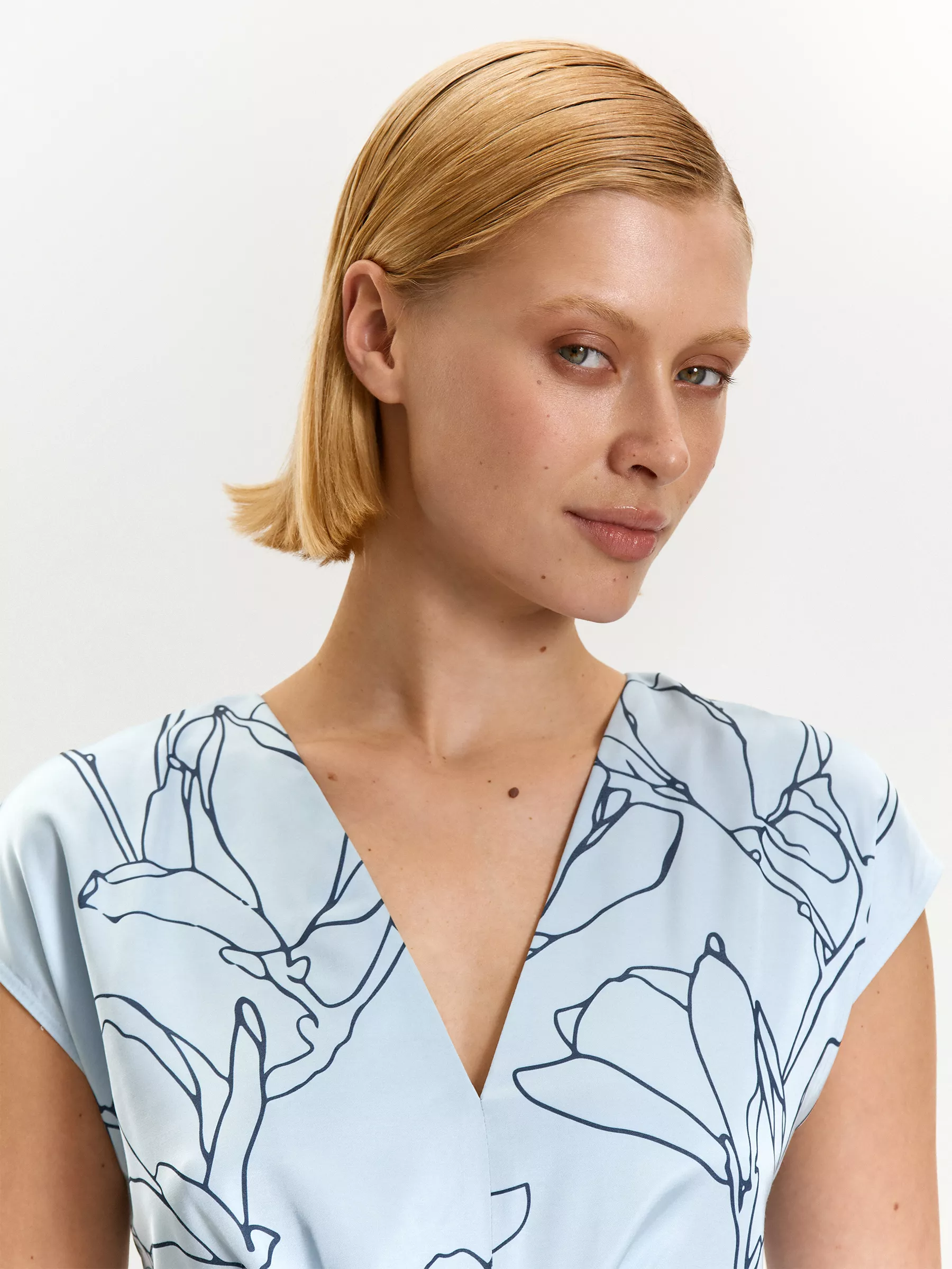 Деликатное платье для любых ваших планов. В нём можно пойти на работу, на свидание, в ресторан, в театр и куда угодно. Эти утончённые магнолии на небесном фоне и благородный крой с отсылкой к оригами везде произведут самое приятное впечатление.