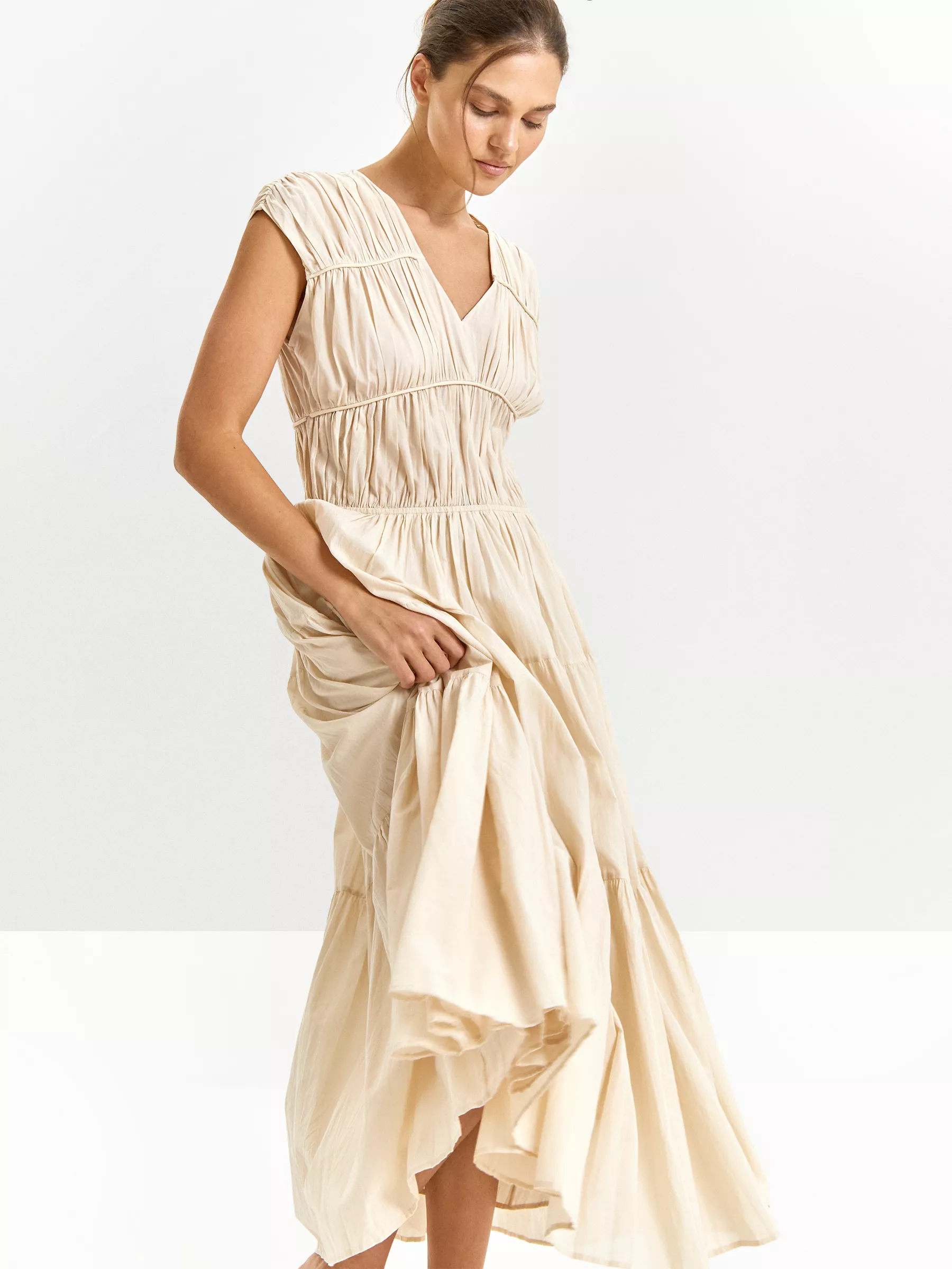 Очаровательное платье в греческом стиле с красивой сборкой и втачным кантом — украшение летнего гардероба. Лёгкое, пышное и воздушное, оно отлично подойдёт для выходных или отпуска. Не просвечивает благодаря приятной к телу подкладке из вискозы. Сделано из хлопка, чтобы образ был не только стильным, но и максимально комфортным в жаркую погоду. Слегка прикрытые плечи, обнажённые ключицы, закрытая спина дают трогательный и чувственный образ в стиле современной романтики.