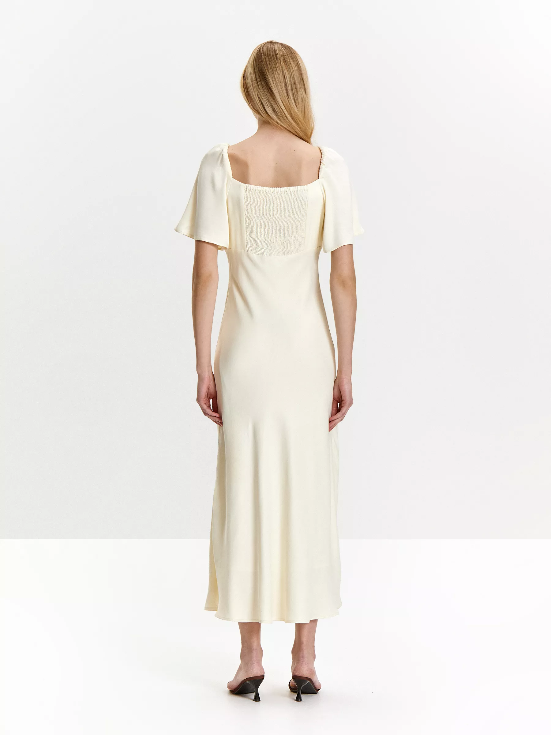 Такая модель идеальна, когда хочется визуально вытянуть силуэт или подчеркнуть стройность. Рукава-крылья добавляют нарядности, а деликатные вытачки под грудью — нежности. Длина макси соответствует долгосрочным трендам года.