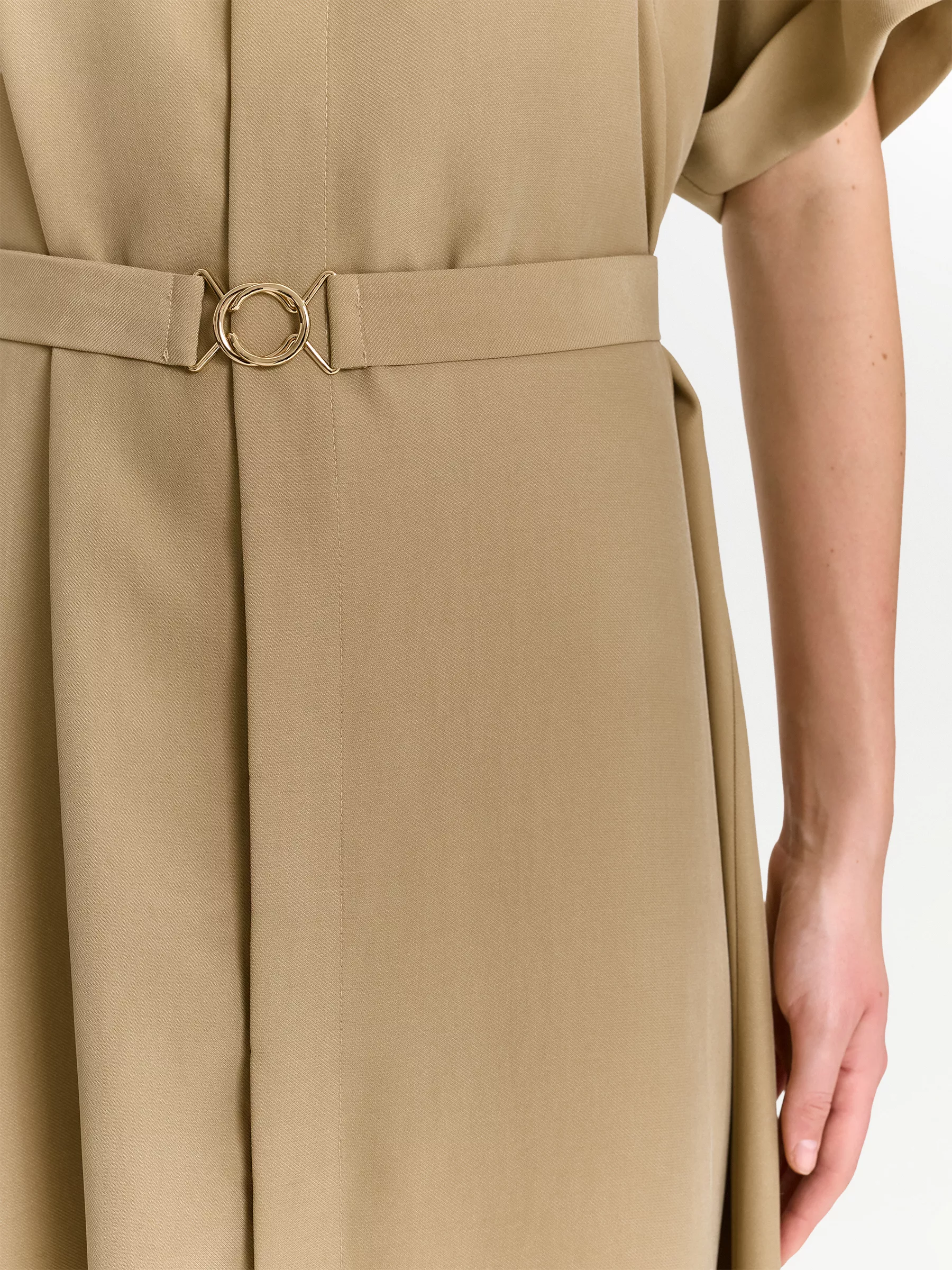 Летнее платье-рубашка в оттенке между бежевым и хаки отлично подойдёт для прогулок, повседневных дел и работы. Его можно надеть и в офис, и на встречу с подругами.